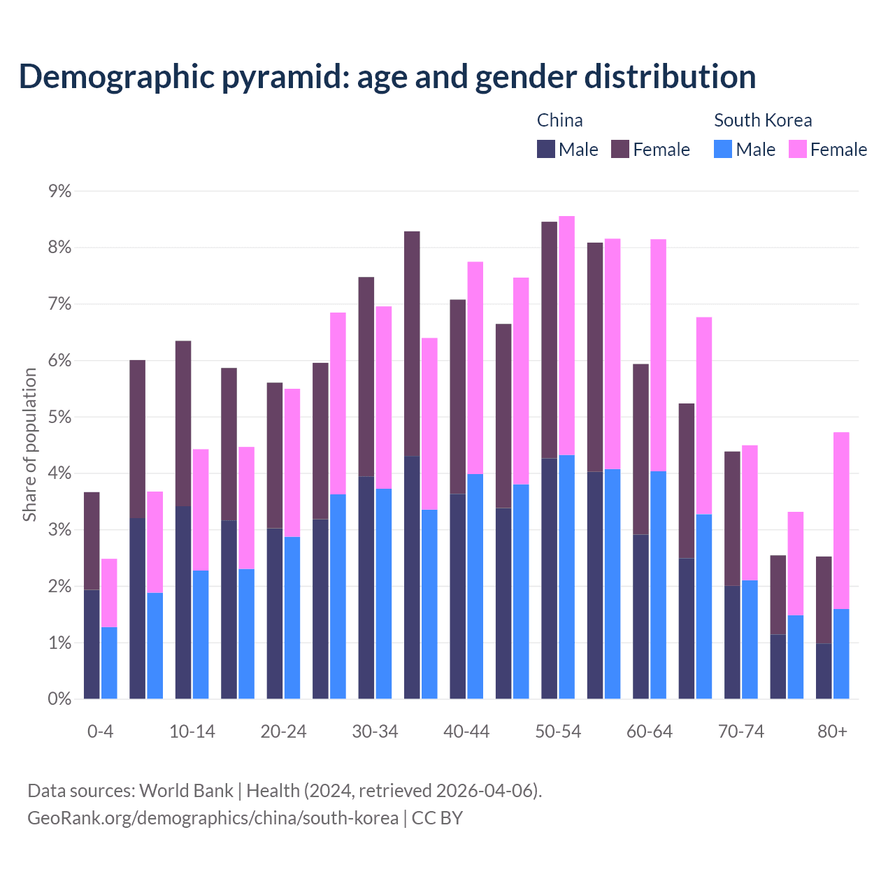 - As of 2026, the population of China is 1.4B vs 51.6M in South Korea - 27.2 times difference.