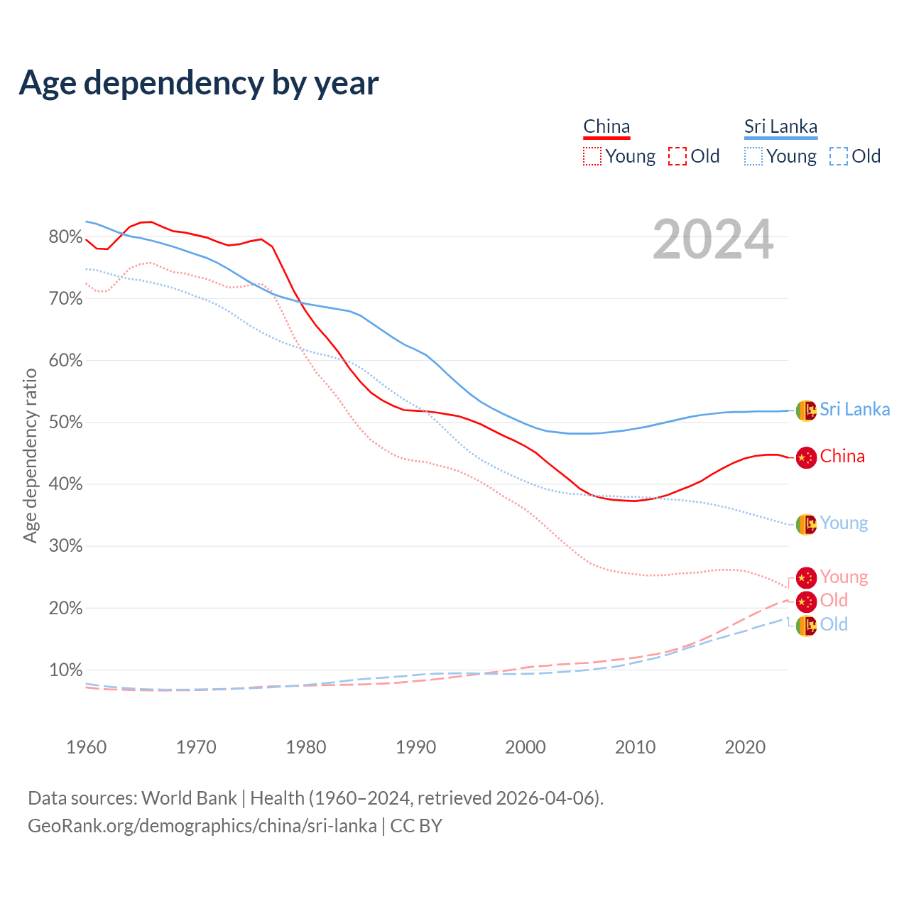 - China is ranked 44/196 by median age (oldest to youngest) vs 81/196 for Sri Lanka.