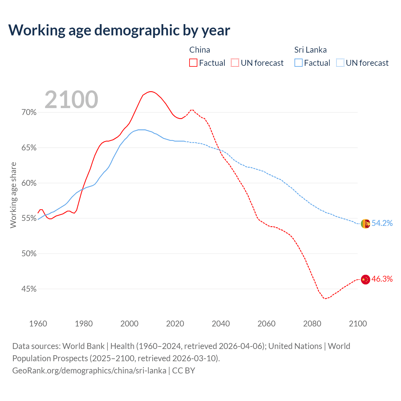Median age China vs Sri Lanka, 1960-2100