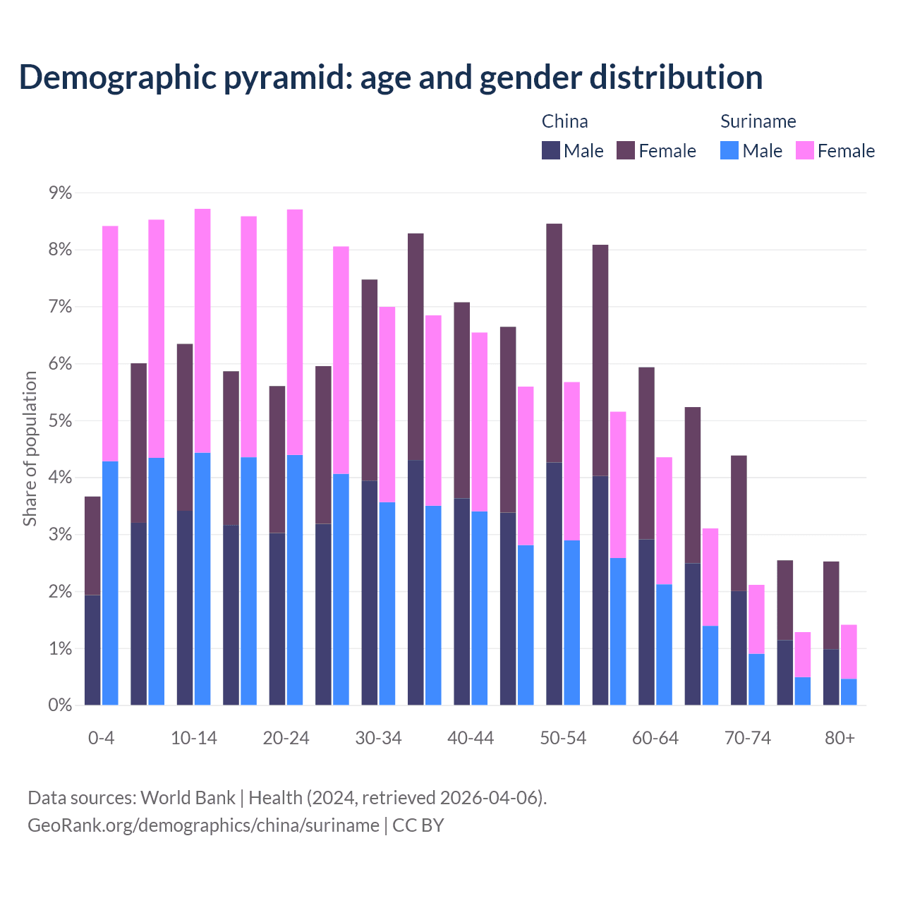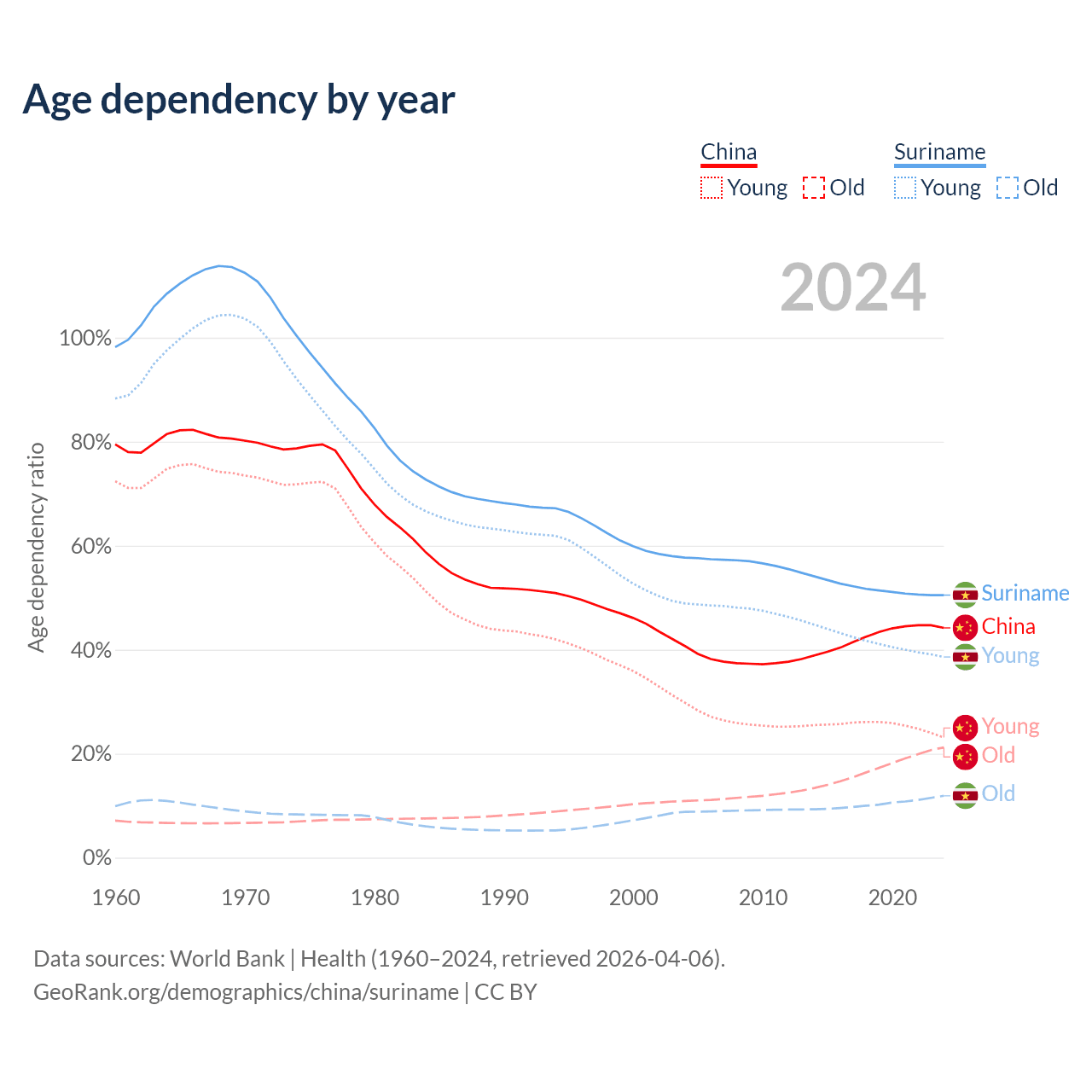 - China is ranked 44/196 by median age (oldest to youngest) vs 109/196 for Suriname.