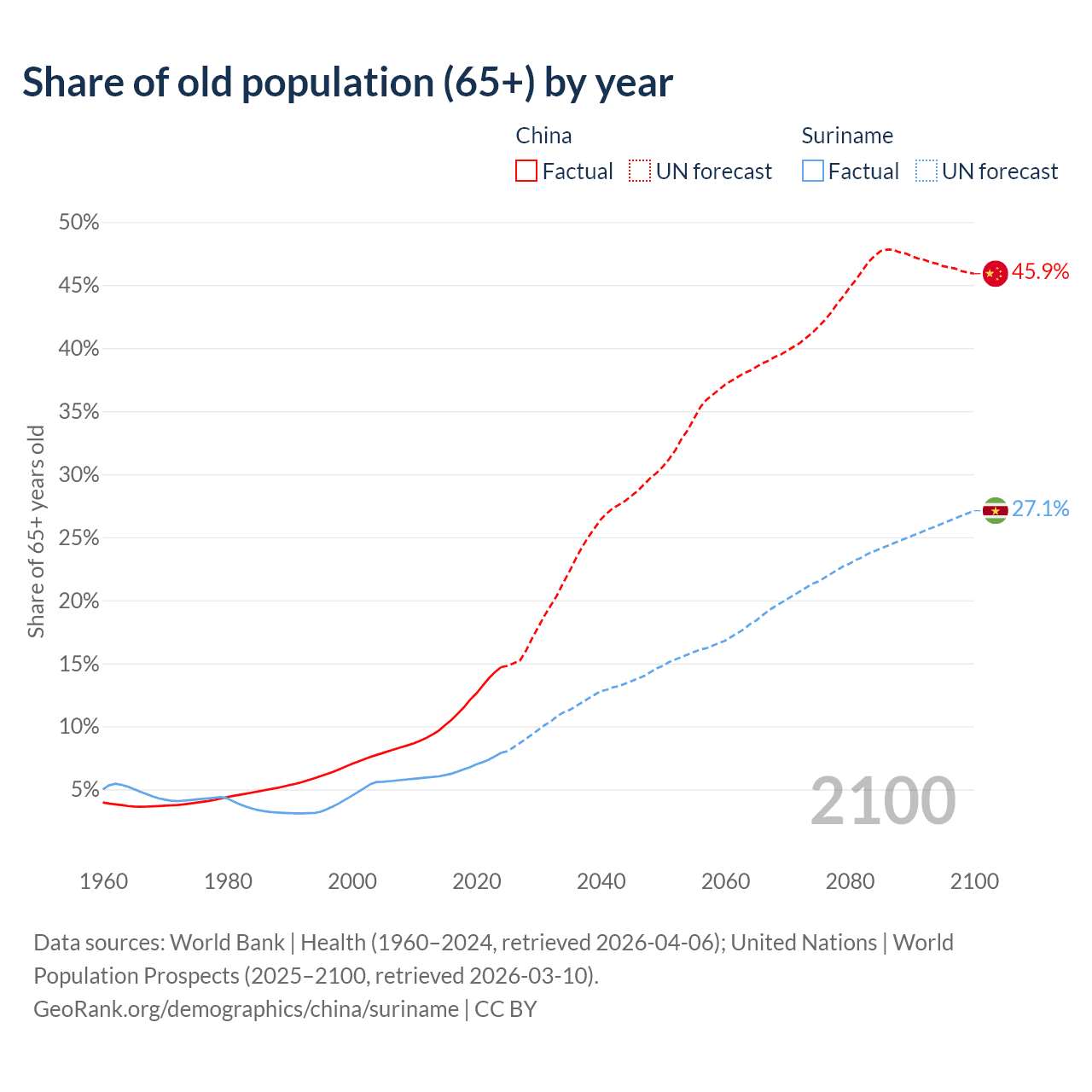 - The share of old-age demographic (65+) in China is 14.7% vs 7.9% in Suriname.