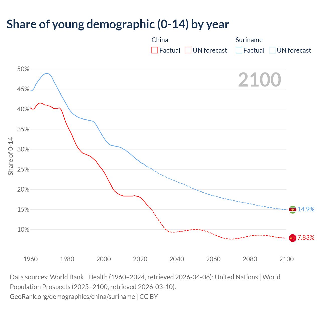 - The share of young demographic (0-15 years old) in China is 16% vs 25.6% in Suriname.