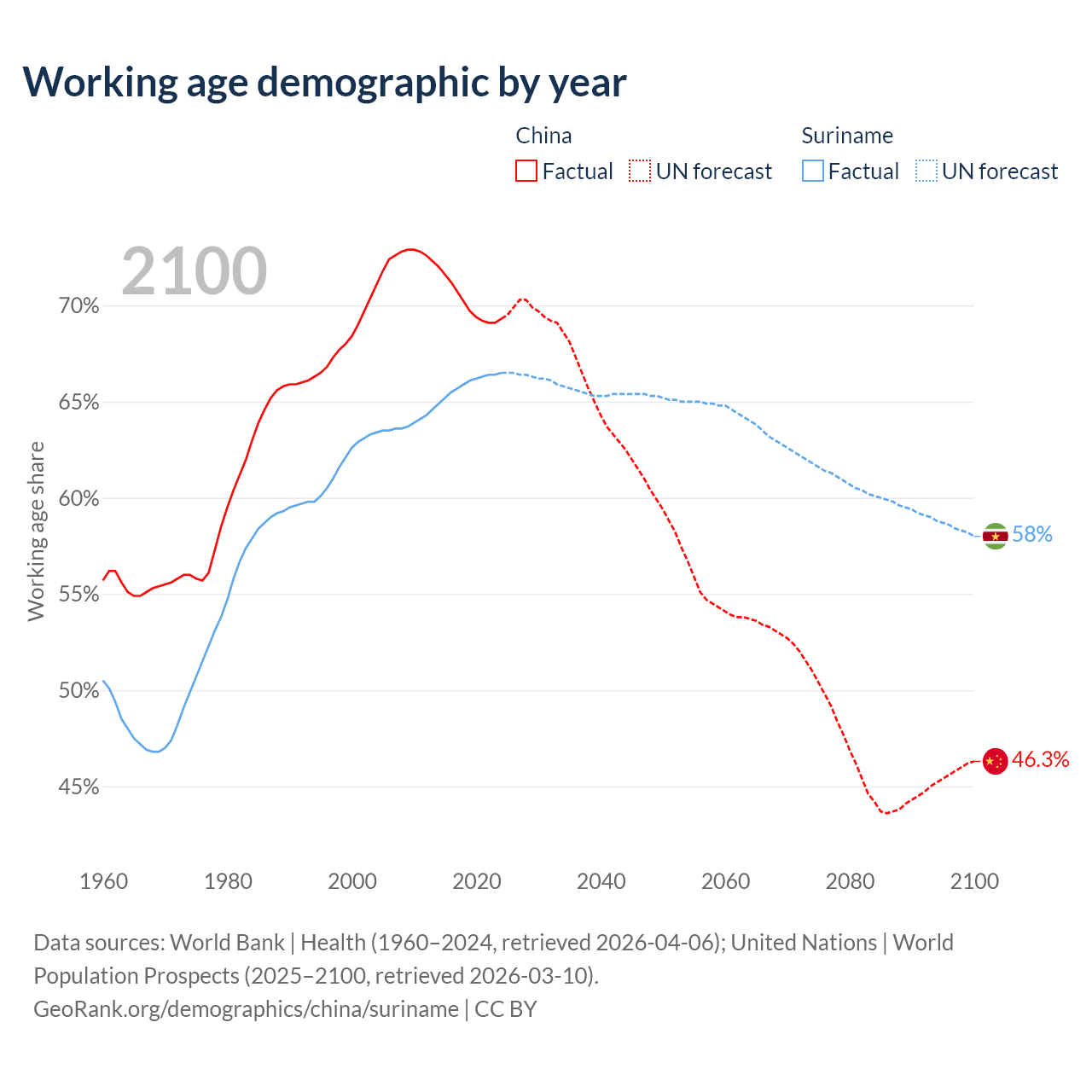 - China has 972M working age adults (aged 15-64) vs 430K in Suriname.