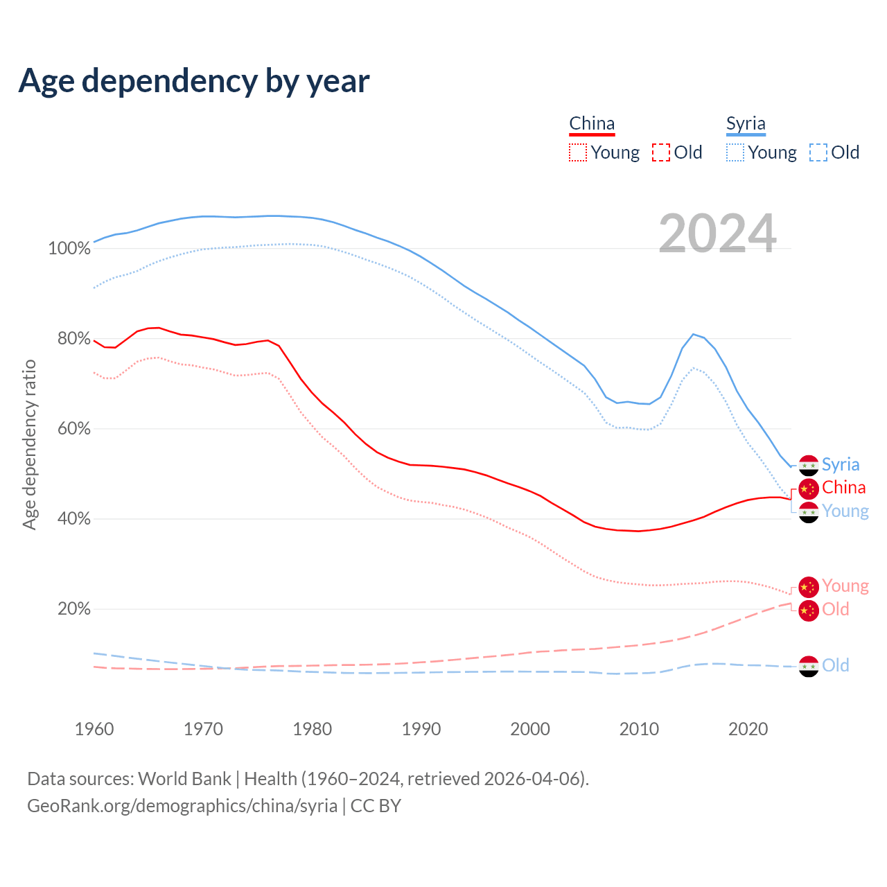 - The share of old-age demographic (65+) in China is 14.7% vs 4.74% in Syria.