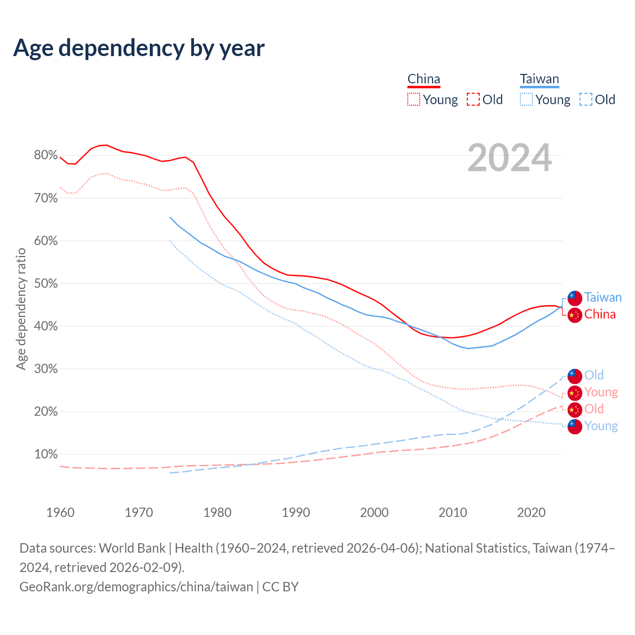 Data sources: World Bank | Health (1960–2024, retrieved 2026-04-06); U.S. Census Bureau (1960–2024, retrieved 2026-02-08); National Statistics, Taiwan (1974–2024, retrieved 2026-02-09).