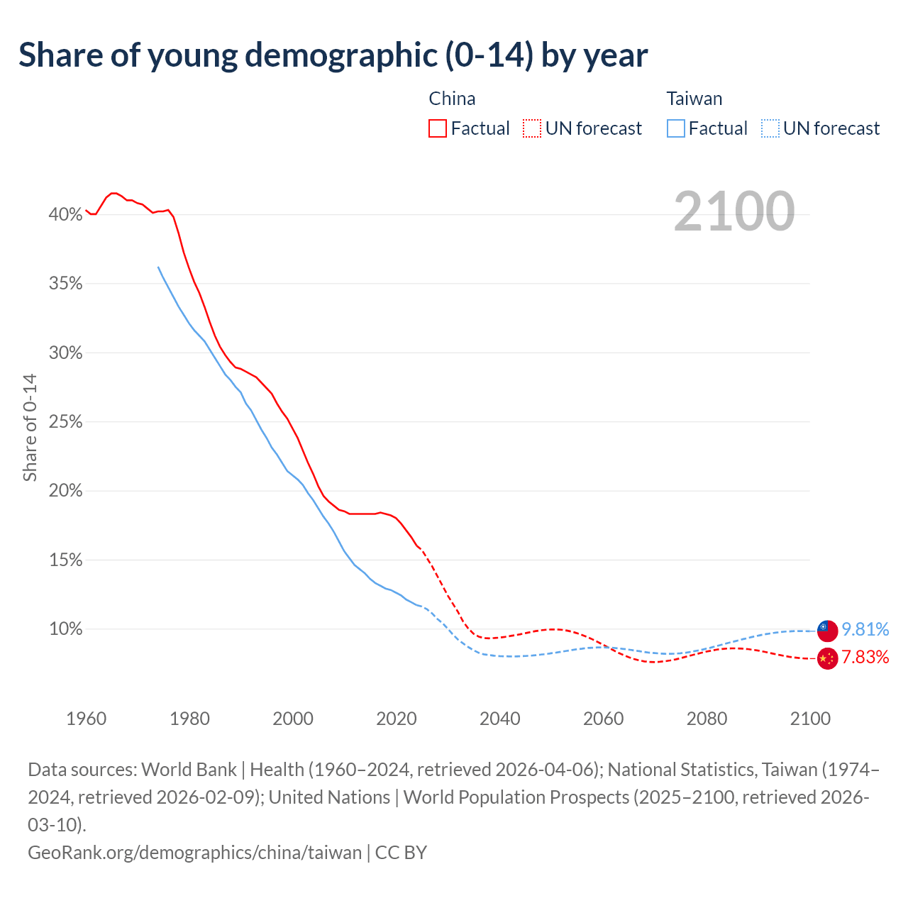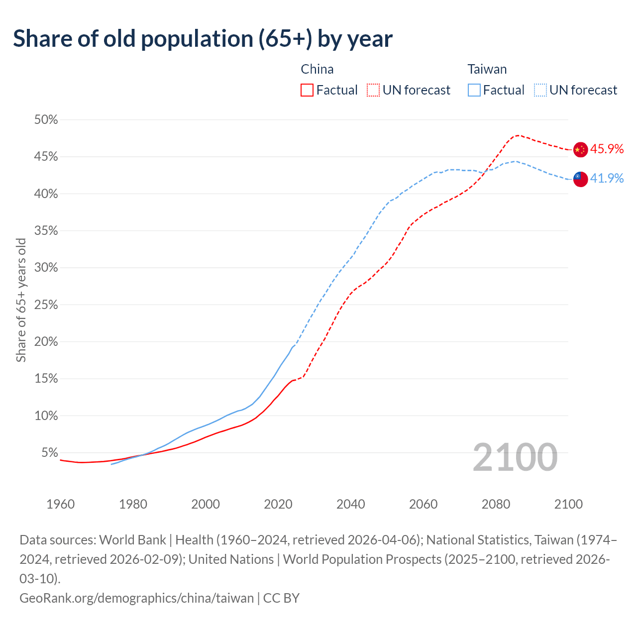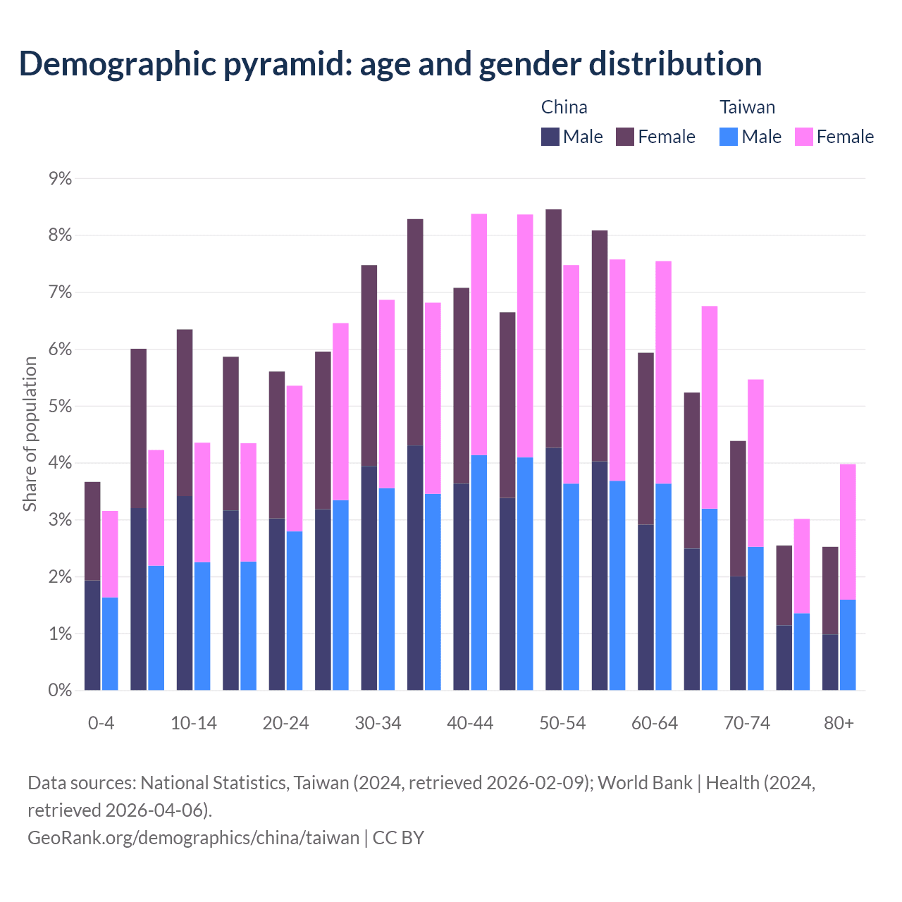- China is ranked 44/196 by median age (oldest to youngest) vs 16/196 for Taiwan.