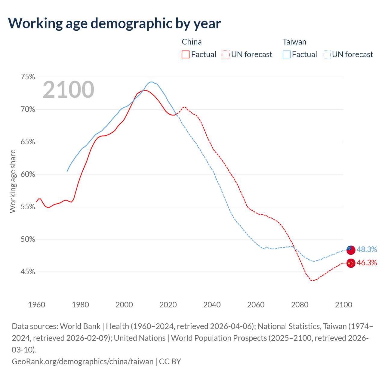 - China has 972M working age adults (aged 15-64) vs 16.1M in Taiwan.