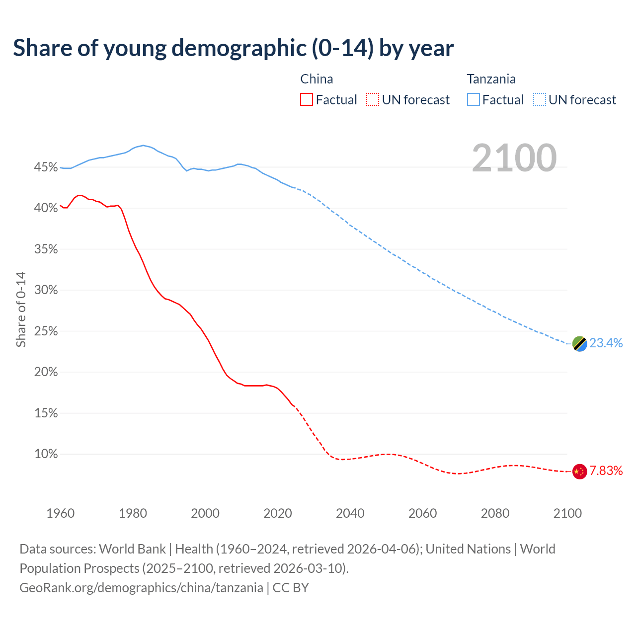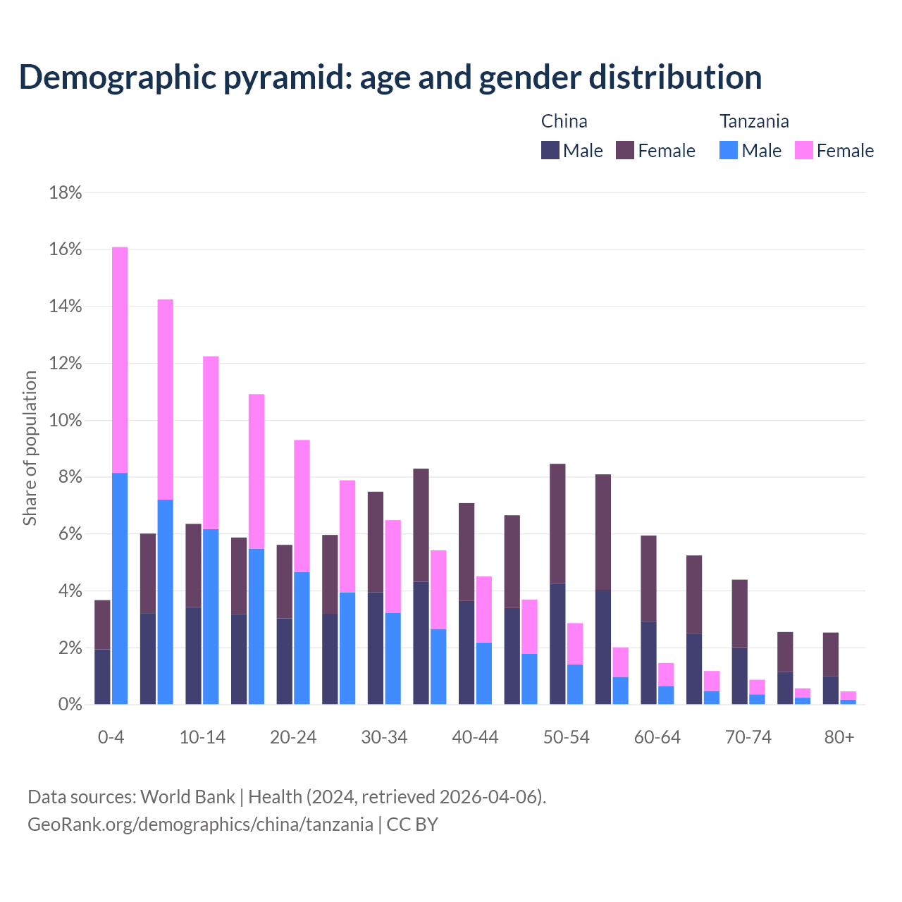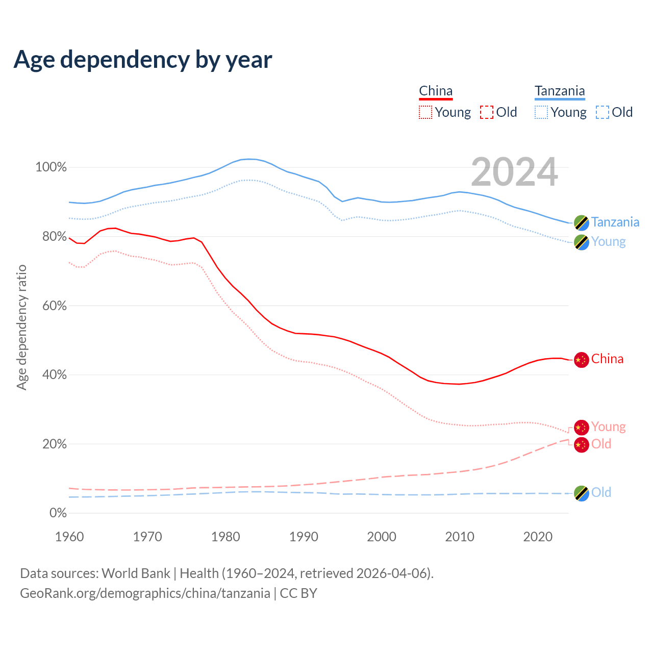 - China is ranked 44/196 by median age (oldest to youngest) vs 184/196 for Tanzania.