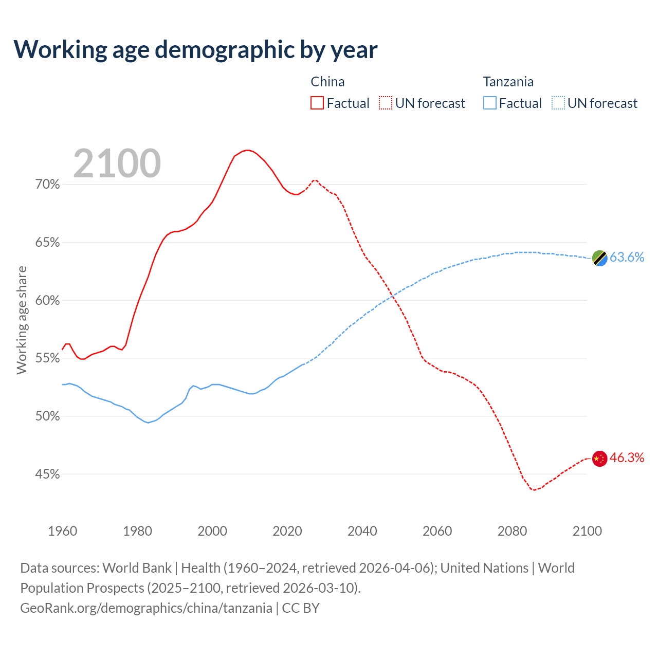- China has 972M working age adults (aged 15-64) vs 39.8M in Tanzania.