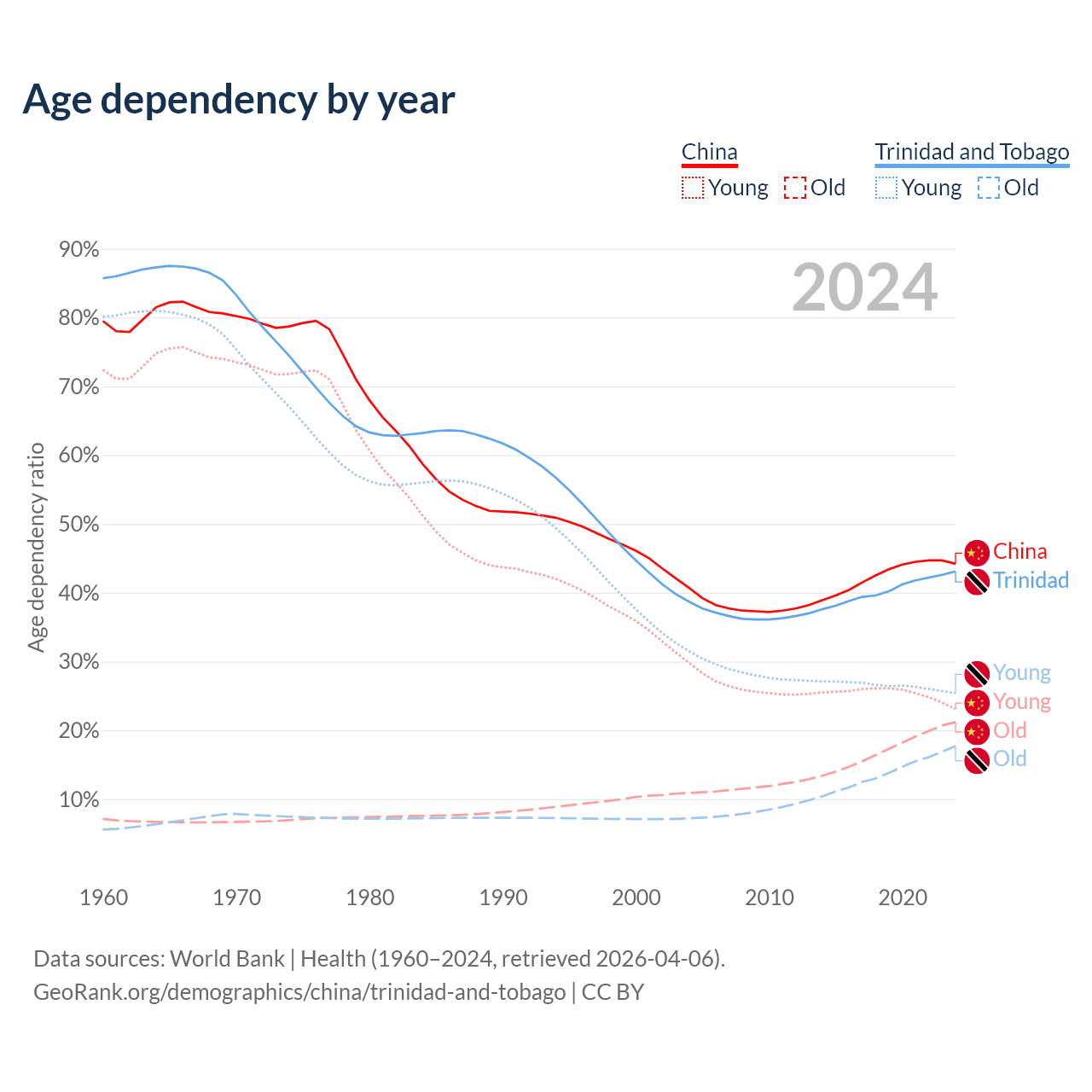 - China is ranked 44/196 by median age (oldest to youngest) vs 58/196 for Trinidad and Tobago.