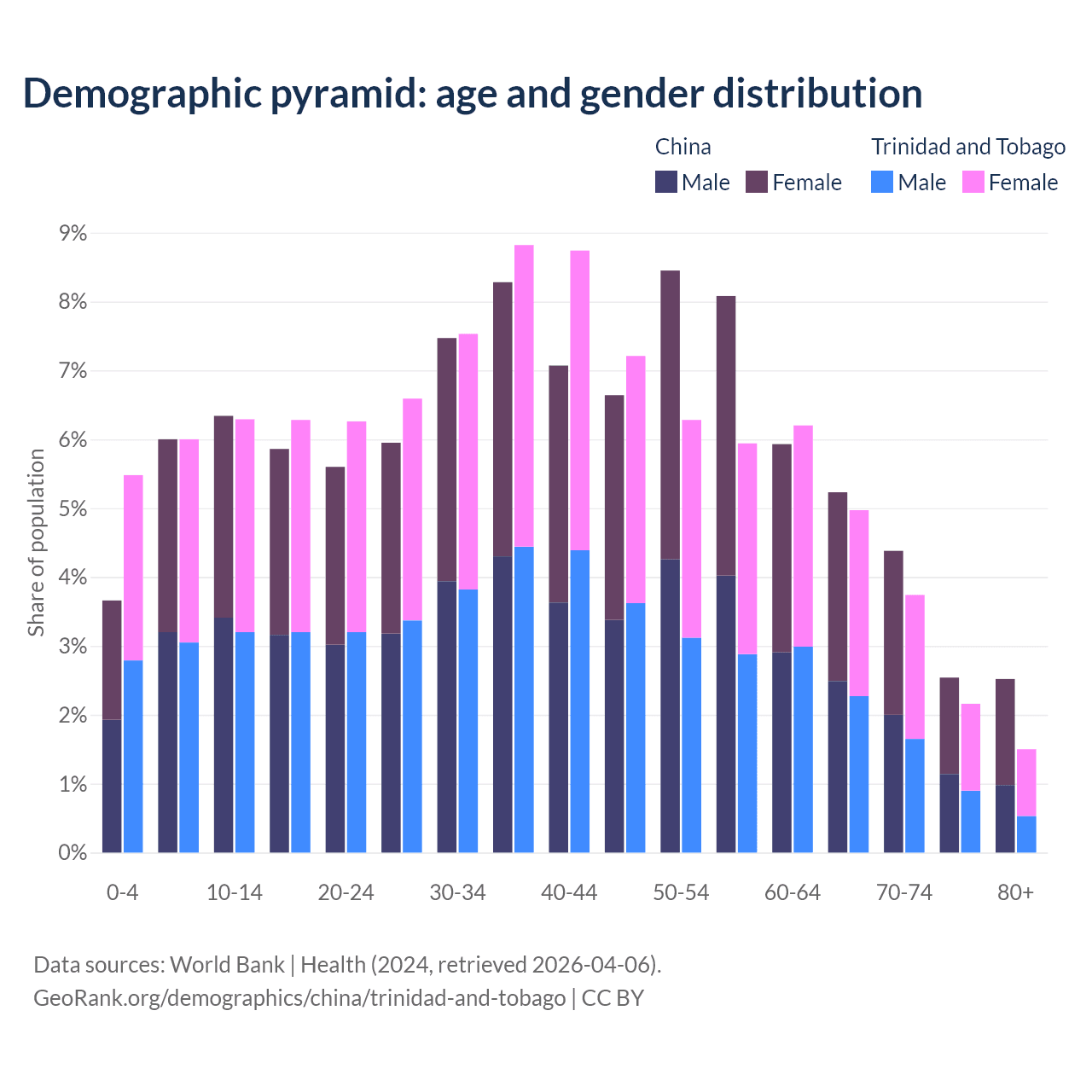 The share of older people aged 65 and over is 14.7% in China and 12.4% in Trinidad and Tobago. Life expectancy in China compared to Trinidad and Tobago .