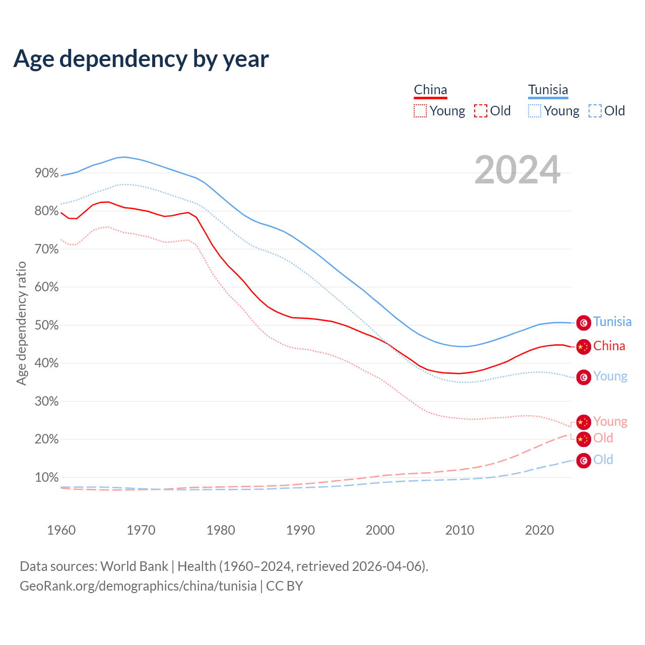 - China is ranked 44/196 by median age (oldest to youngest) vs 86/196 for Tunisia.
