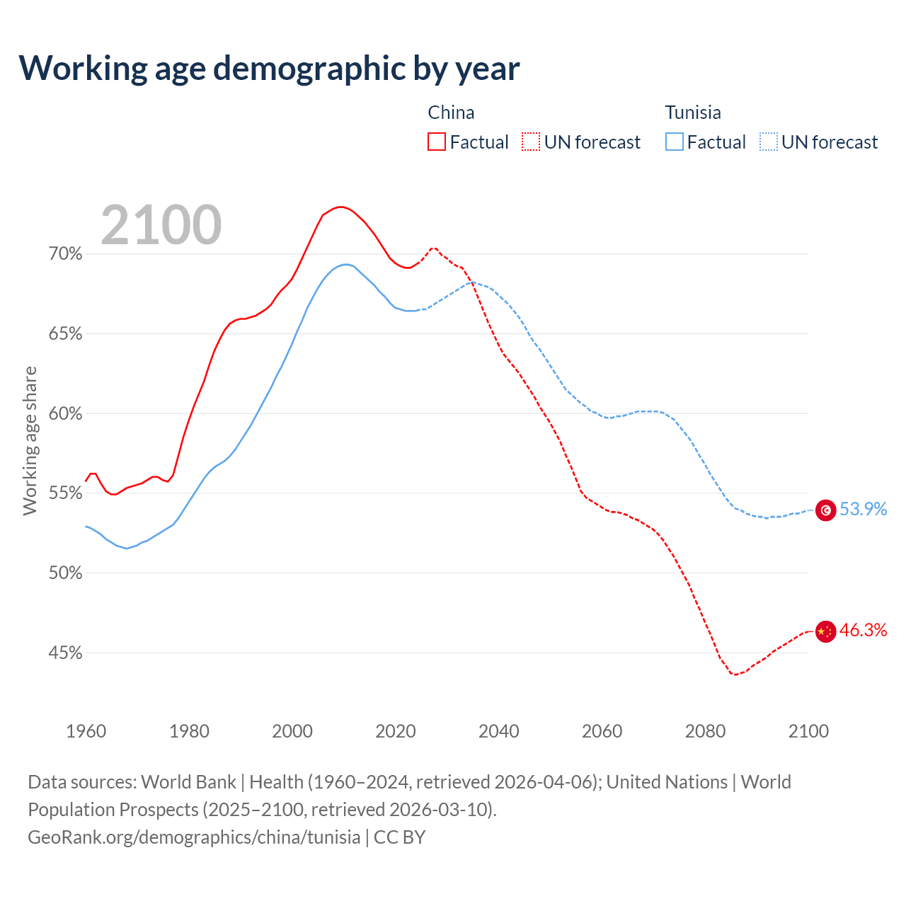 - China has 972M working age adults (aged 15-64) vs 8.26M in Tunisia.