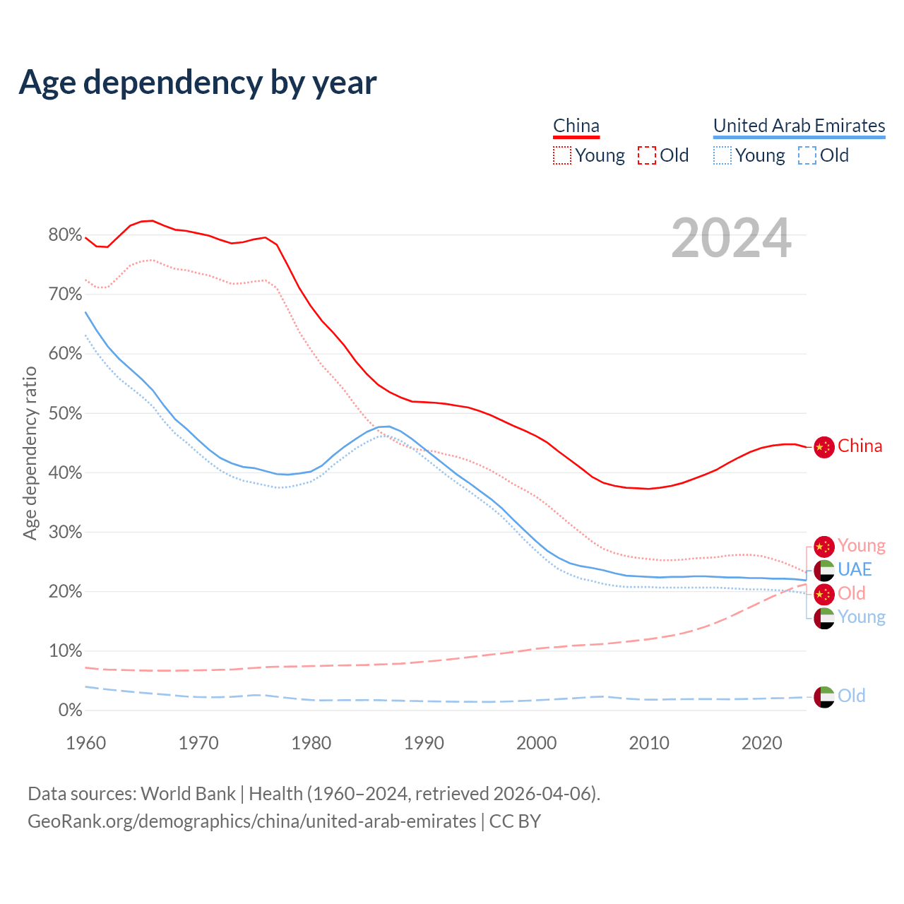 - China is ranked 44/196 by median age (oldest to youngest) vs 91/196 for the United Arab Emirates.