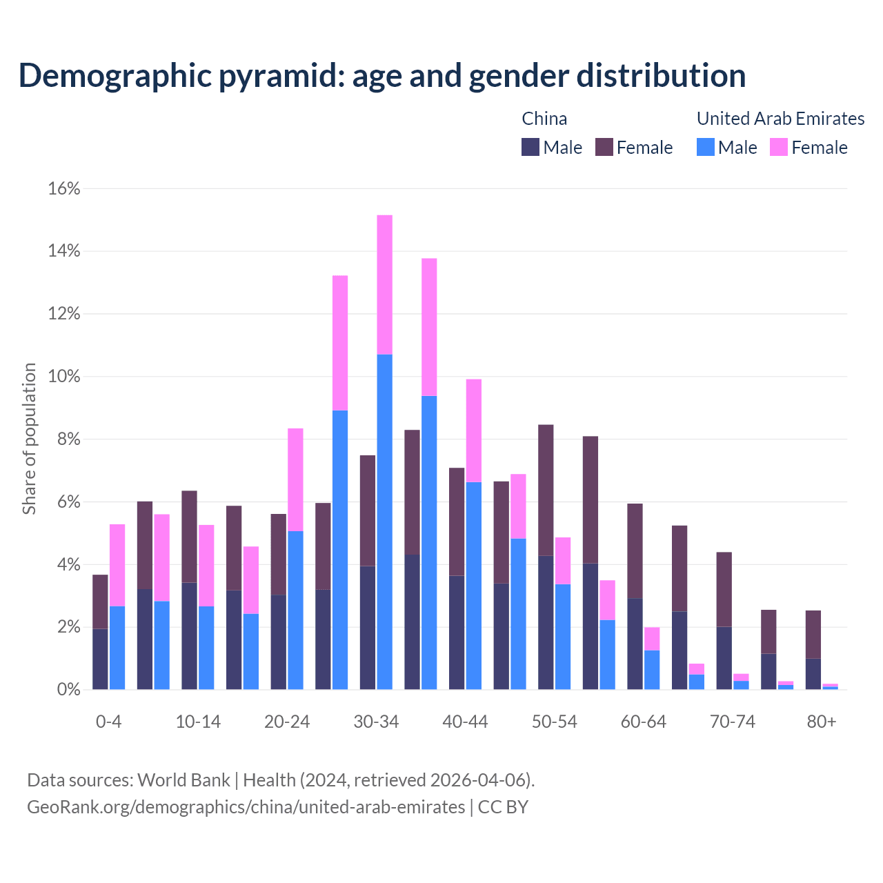 - As of 2026, the population of China is 1.4B vs 11.7M in the United Arab Emirates - 120 times difference.