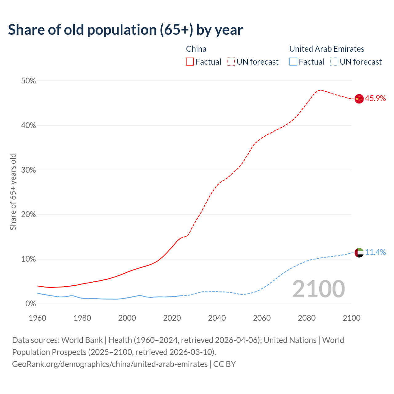 The share of older people aged 65 and over is 14.7% in China and 1.77% in the United Arab Emirates. Life expectancy in China compared to the United Arab Emirates .
