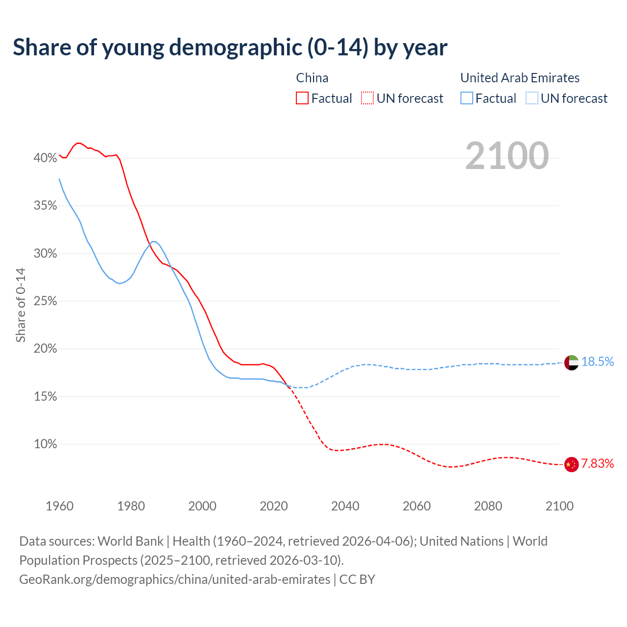 - The share of young demographic (0-15 years old) in China is 16% vs 16.1% in the United Arab Emirates.