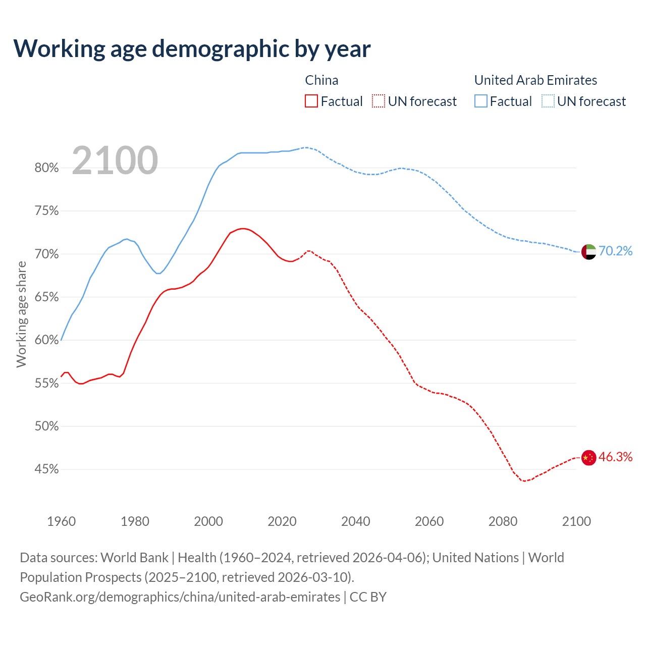 - China has 972M working age adults (aged 15-64) vs 9.6M in the United Arab Emirates.