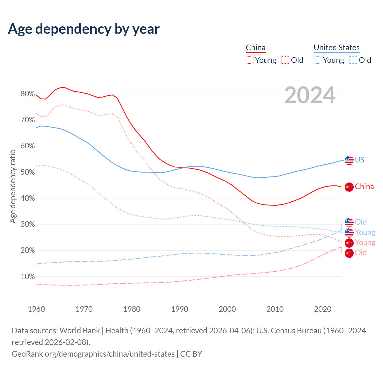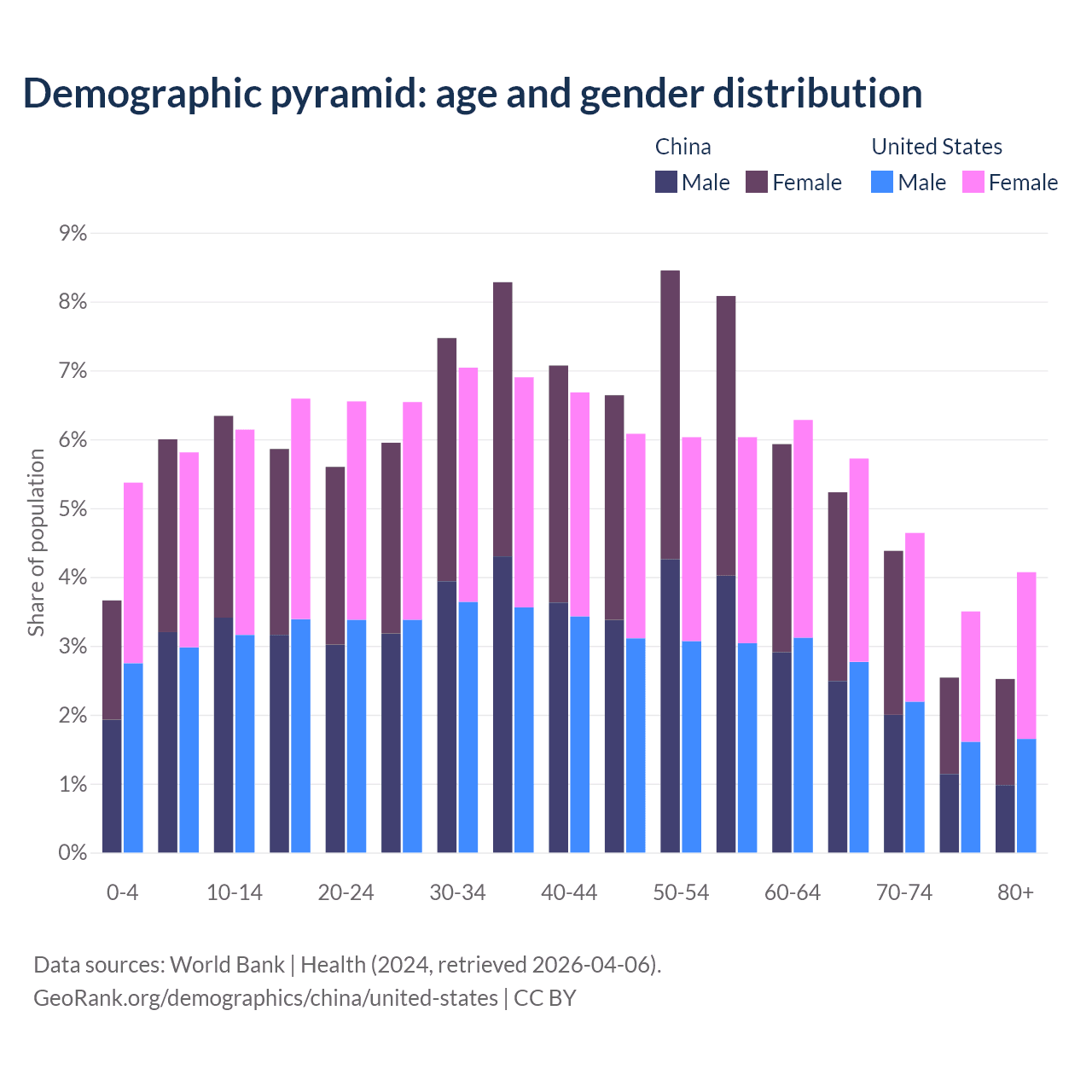 - China is ranked 44/196 by median age (oldest to youngest) vs 50/196 for the United States.