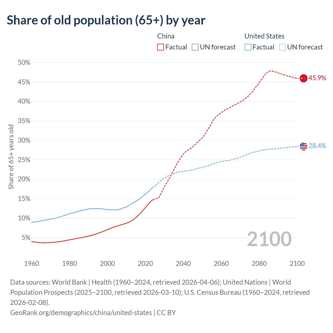 The share of older people aged 65 and over is 14.7% in China and 17.9% in the United States. Life expectancy in China compared to the United States .