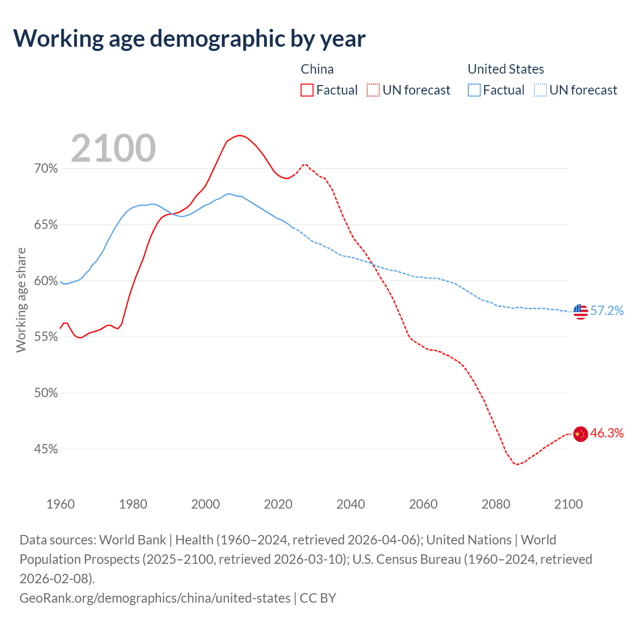 - China has 972M working age adults (aged 15-64) vs 223M in the United States.