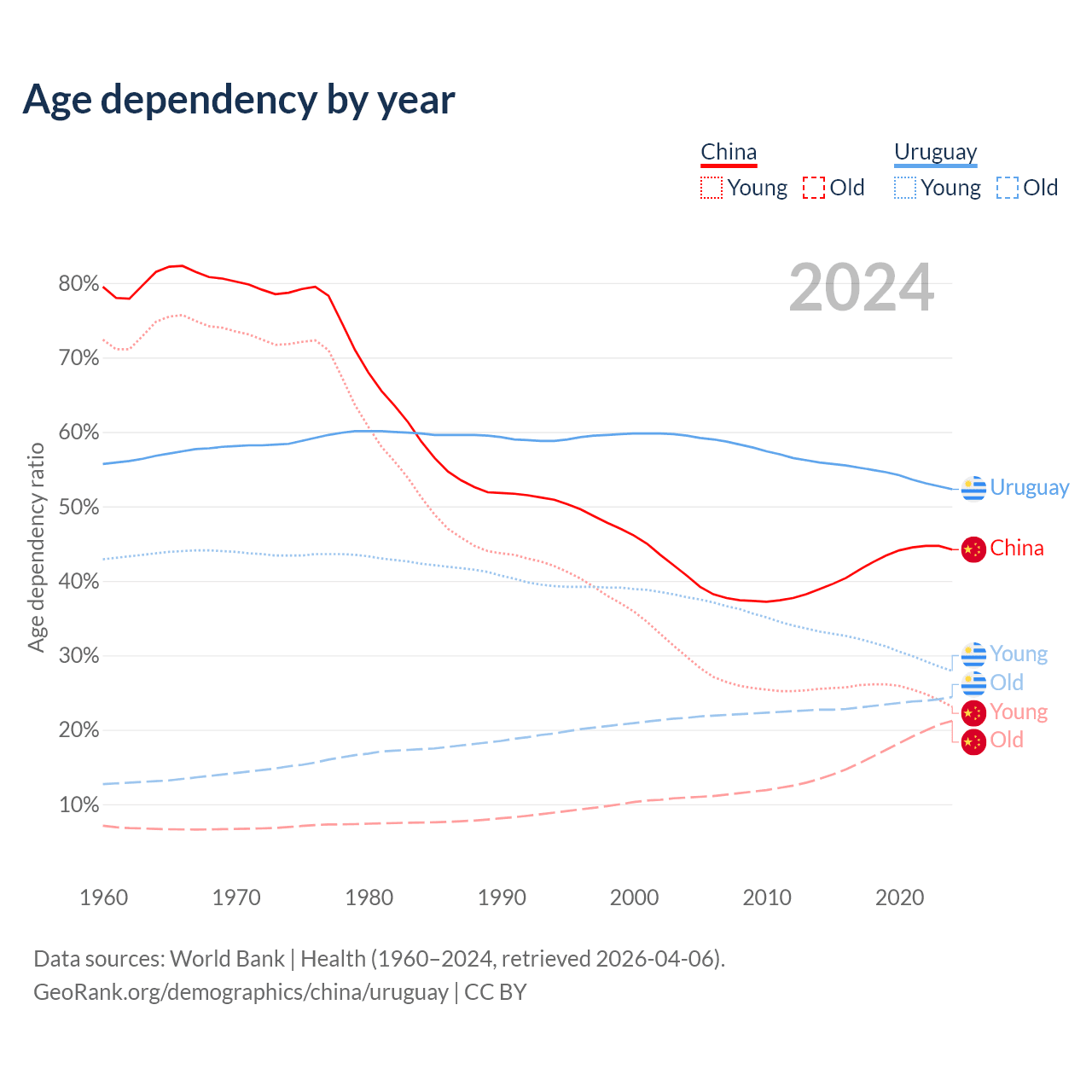 - China is ranked 44/196 by median age (oldest to youngest) vs 63/196 for Uruguay.