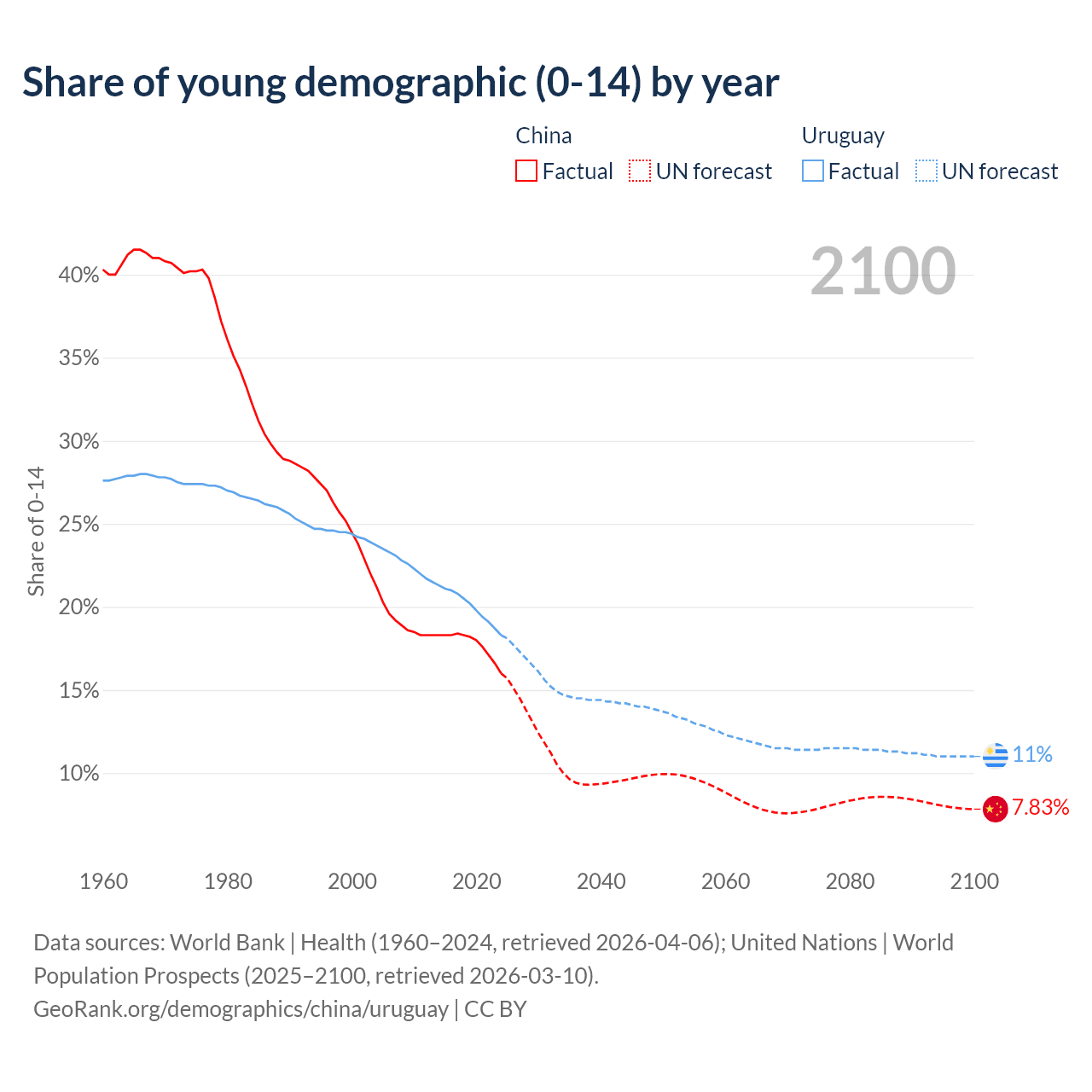 - The share of young demographic (0-15 years old) in China is 16% vs 18.3% in Uruguay.