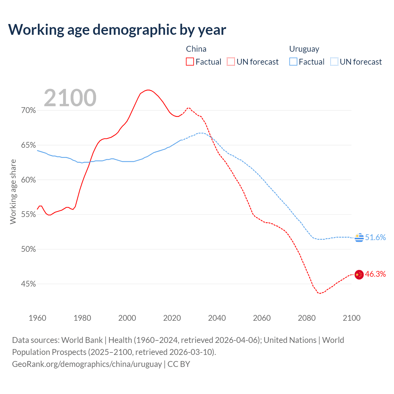 Median age China vs Uruguay, 1960-2100