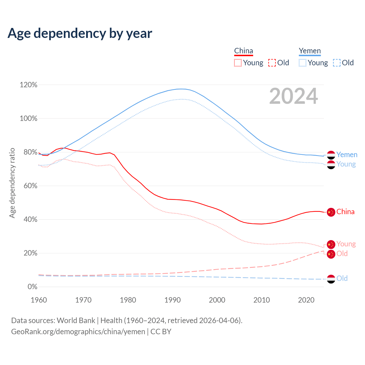 - China is ranked 44/196 by median age (oldest to youngest) vs 174/196 for Yemen.