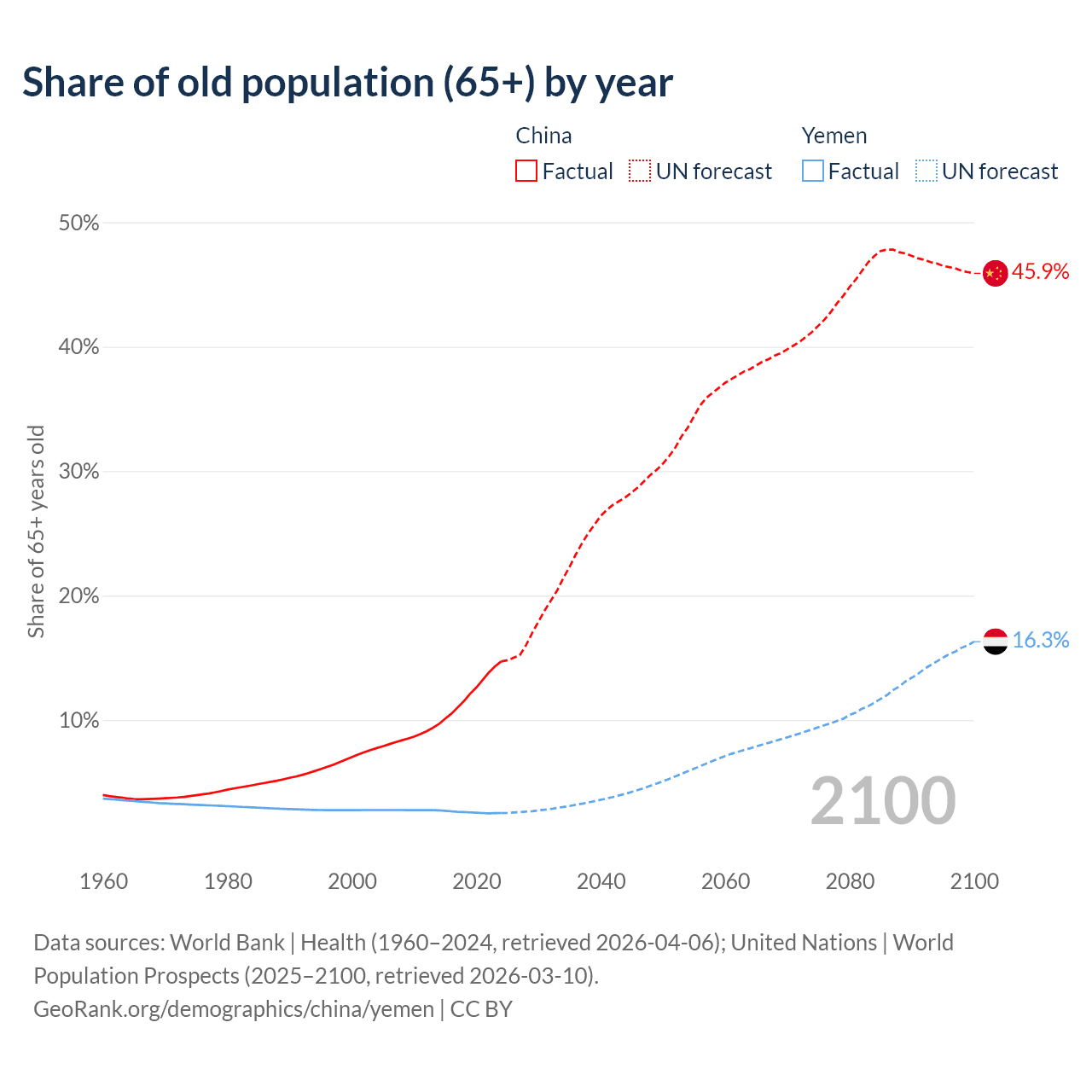 The share of older people aged 65 and over is 14.7% in China and 2.52% in Yemen. Life expectancy in China compared to Yemen .