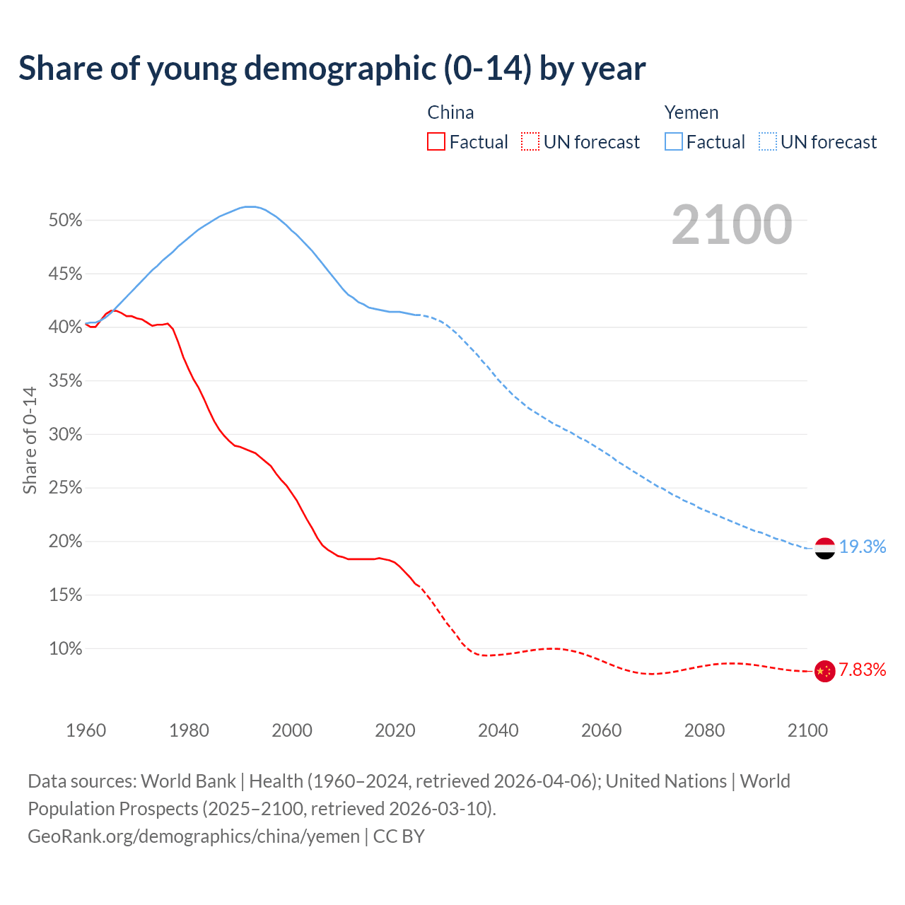 - The share of young demographic (0-15 years old) in China is 16% vs 41.1% in Yemen.