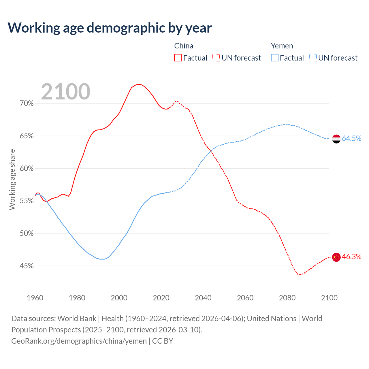 - China has 972M working age adults (aged 15-64) vs 24.4M in Yemen.