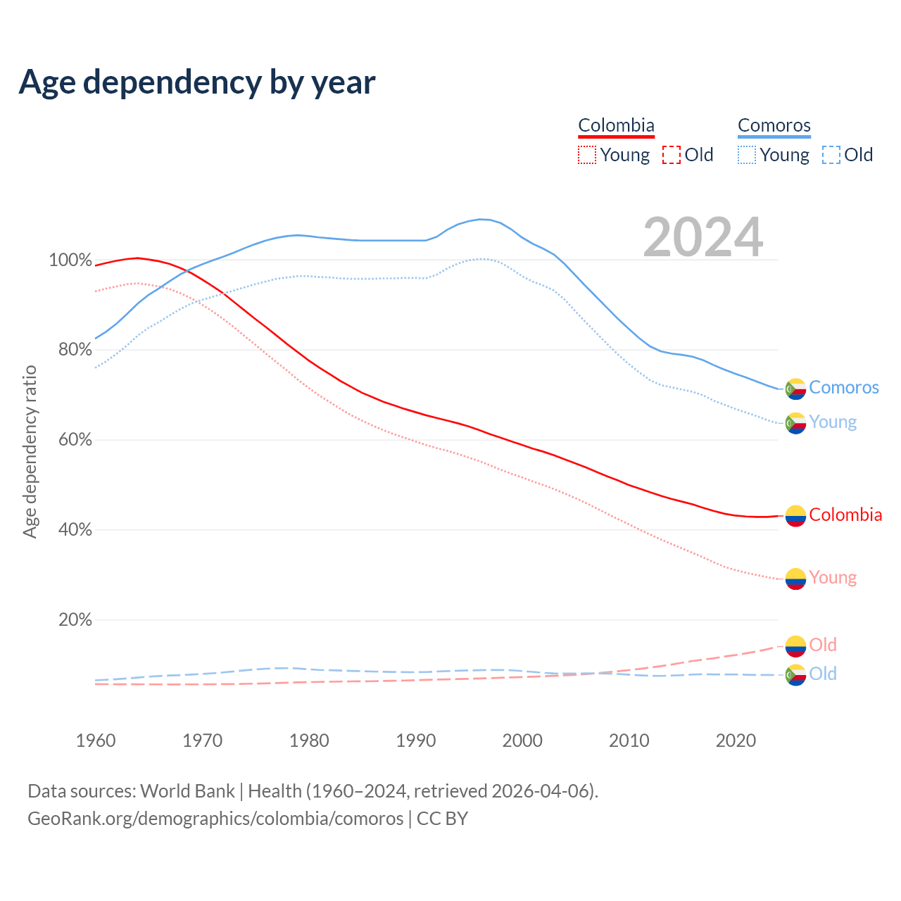 - The share of old-age demographic (65+) in Colombia is 9.78% vs 4.47% in Comoros.