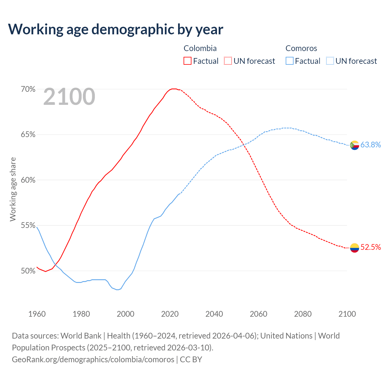 Median age Colombia vs Comoros, 1960-2100