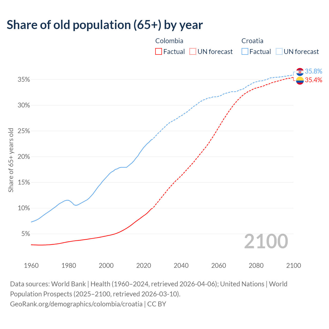 Median age Colombia vs Croatia, 1960-2100
