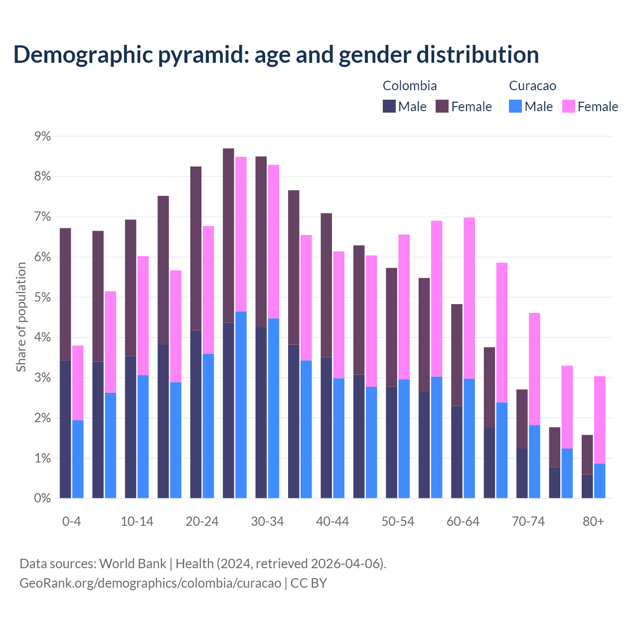 - The median age in Colombia is 33.1 years compared to 39.5 years in Curacao.