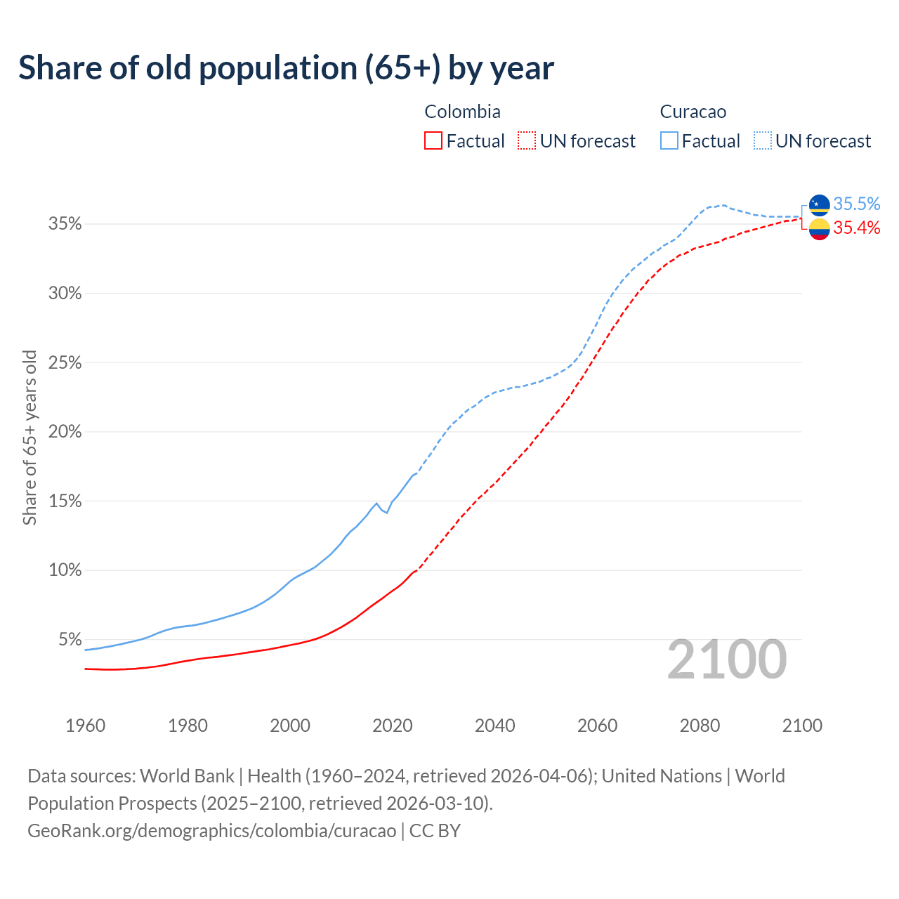 - The share of old-age demographic (65+) in Colombia is 9.78% vs 16.8% in Curacao.
