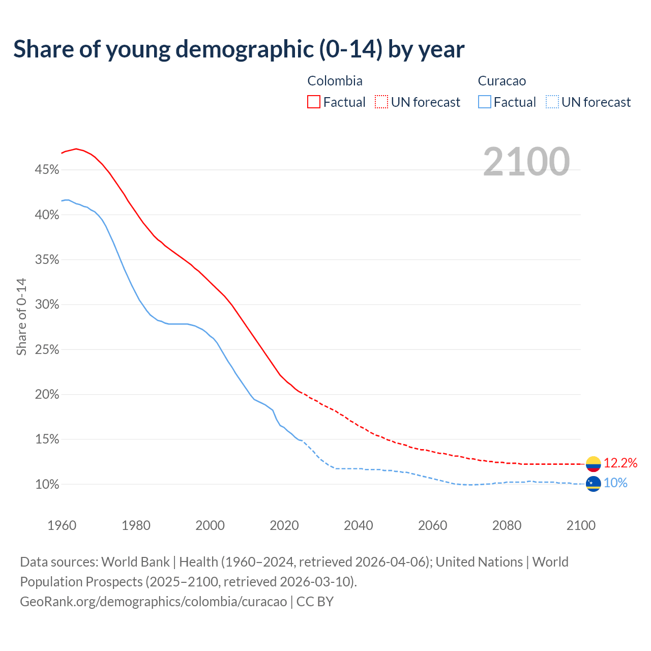 - The share of young demographic (0-15 years old) in Colombia is 20.3% vs 14.9% in Curacao.