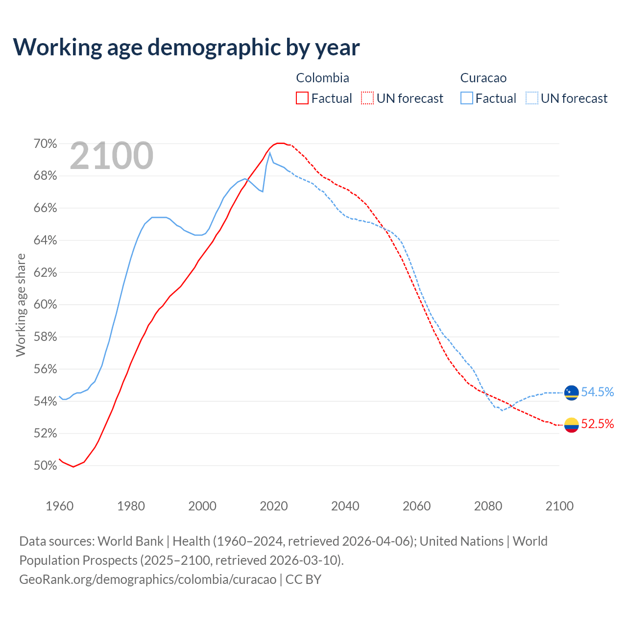 - Colombia has 37.8M working age adults (aged 15-64) vs 107K in Curacao.