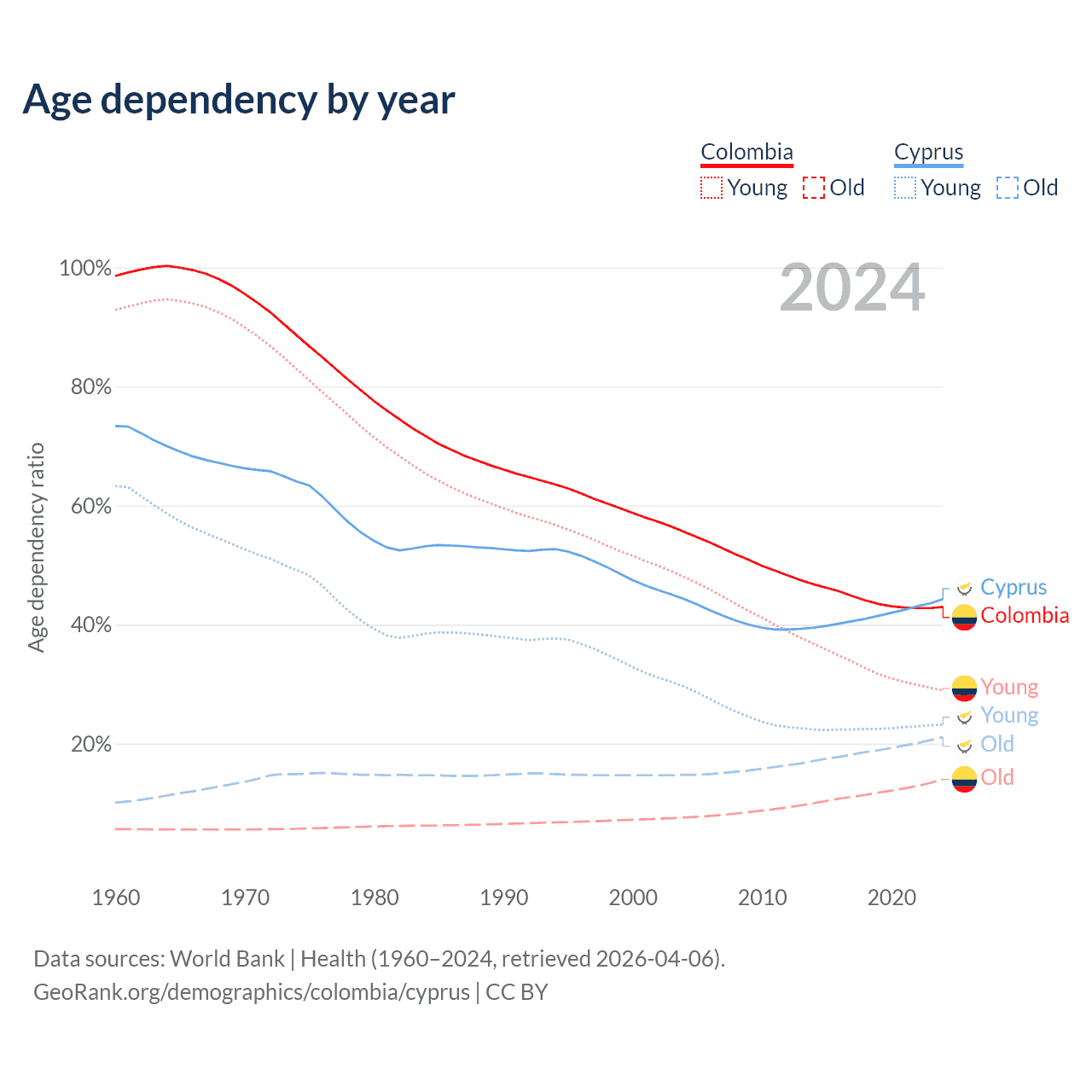 - Colombia is ranked 89/196 by median age (oldest to youngest) vs 52/196 for Cyprus.
