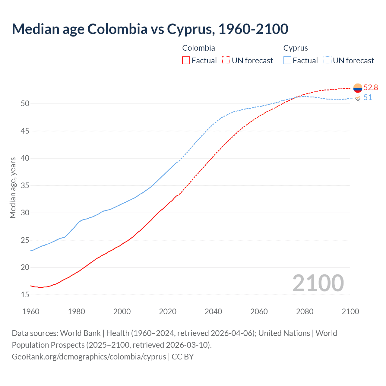 - The median age in Colombia is 33.1 years compared to 39.2 years in Cyprus.