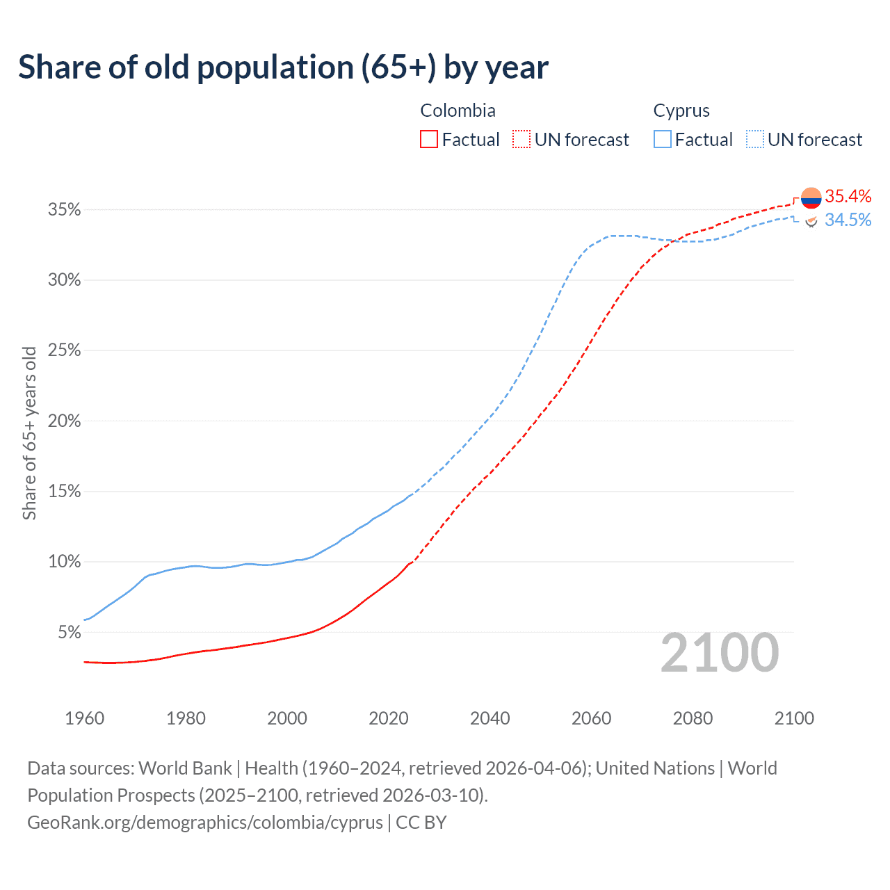 - The share of old-age demographic (65+) in Colombia is 9.78% vs 14.6% in Cyprus.