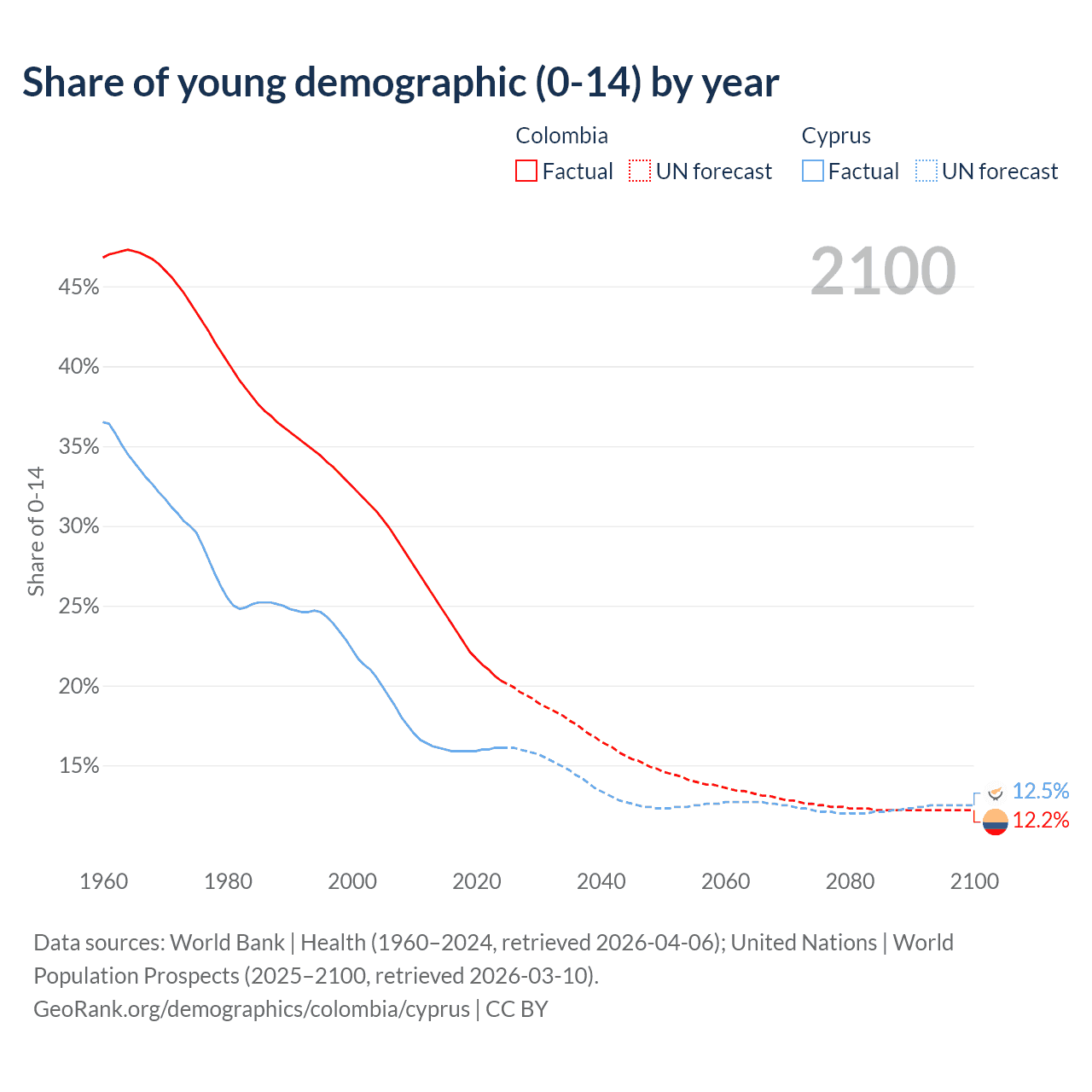 - The share of young demographic (0-15 years old) in Colombia is 20.3% vs 16.1% in Cyprus.