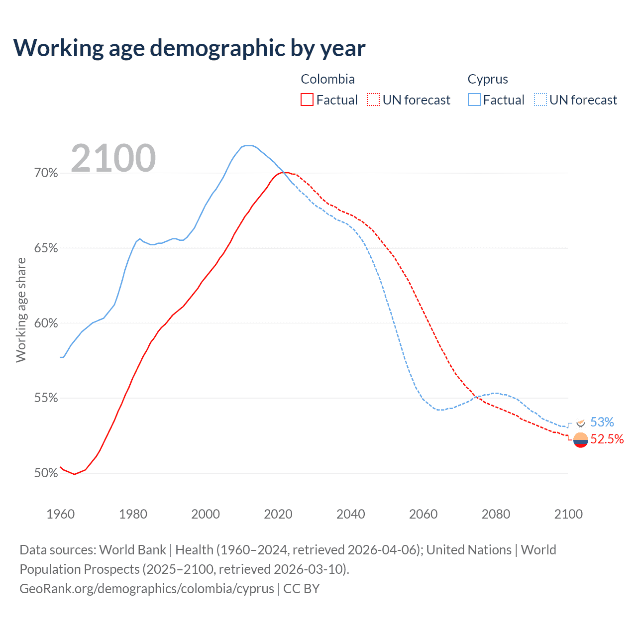 - Colombia has 37.8M working age adults (aged 15-64) vs 961K in Cyprus.