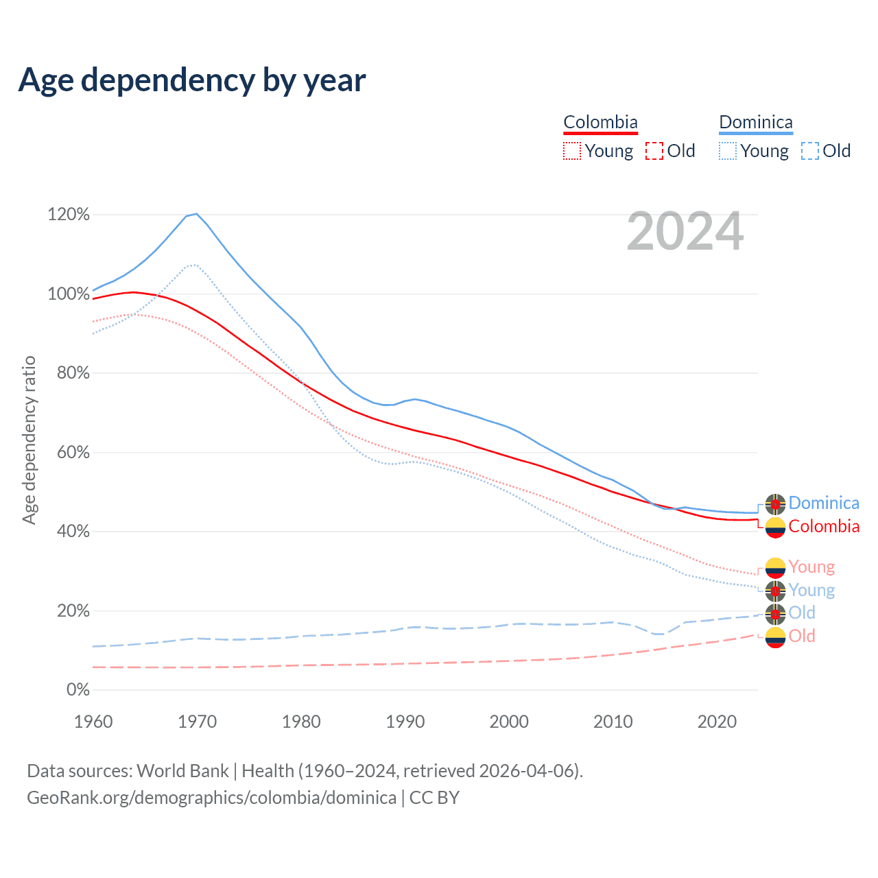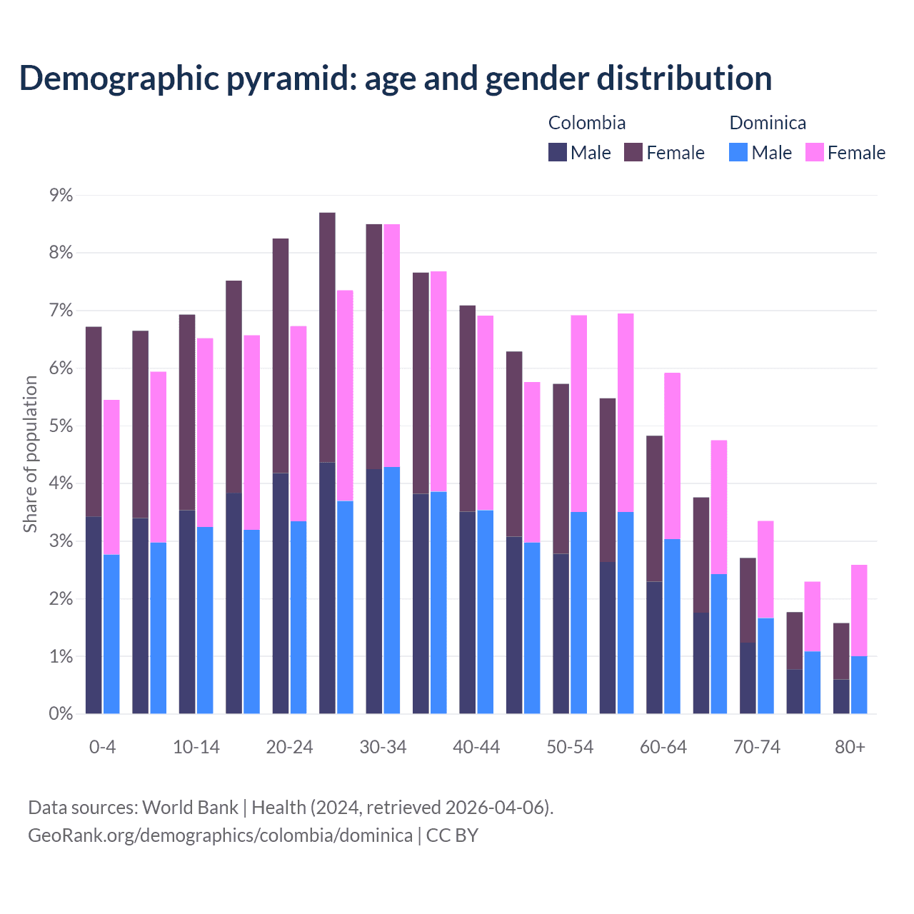 - The share of young demographic (0-15 years old) in Colombia is 20.3% vs 17.9% in Dominica.