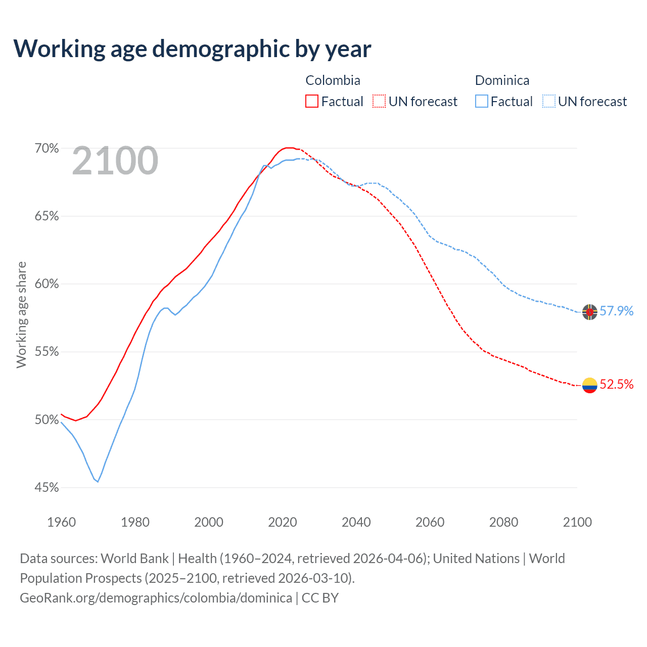 Median age Colombia vs Dominica, 1960-2100