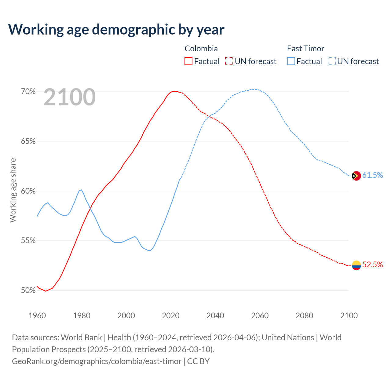 - Colombia has 37.8M working age adults (aged 15-64) vs 880K in East Timor.