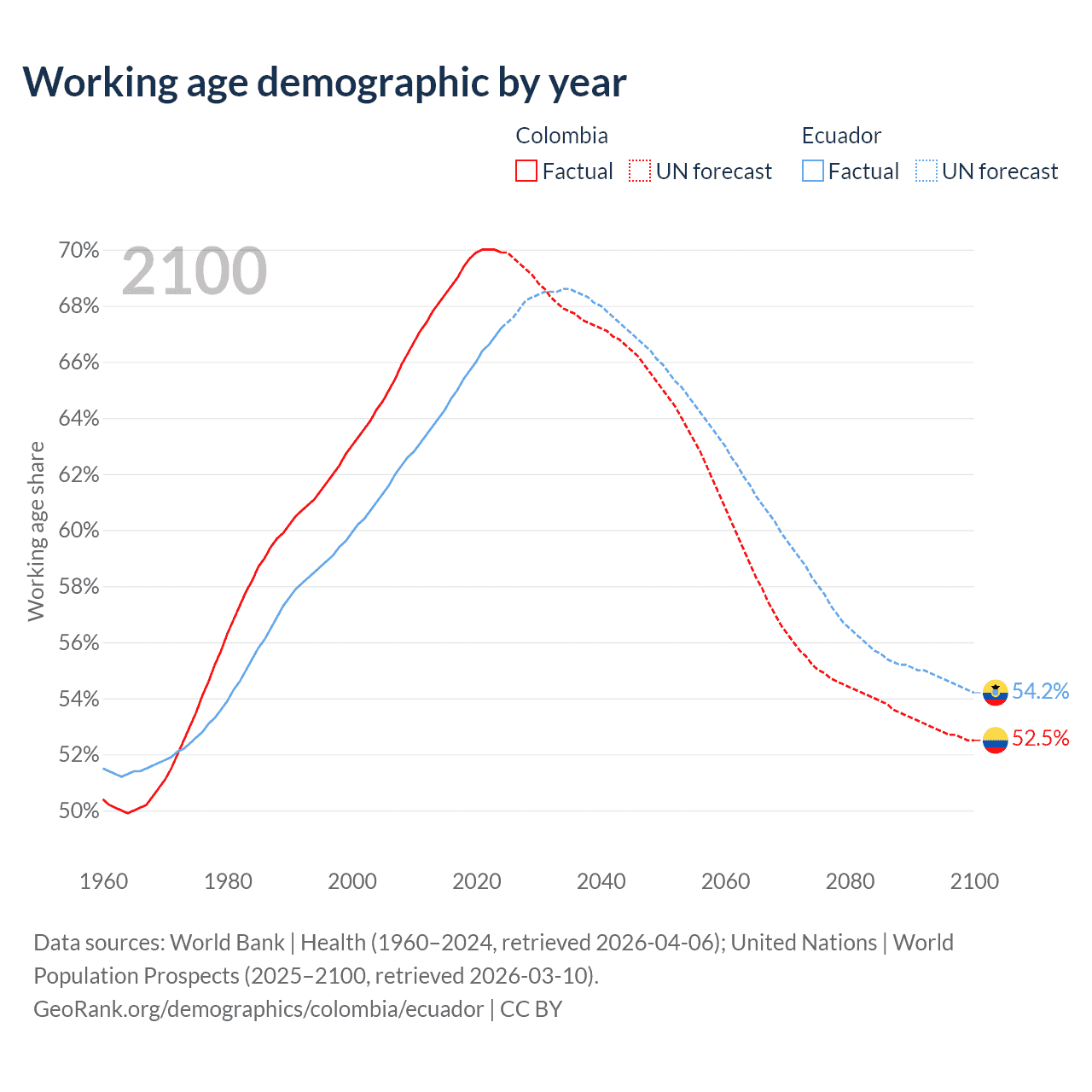 Median age Colombia vs Ecuador, 1960-2100