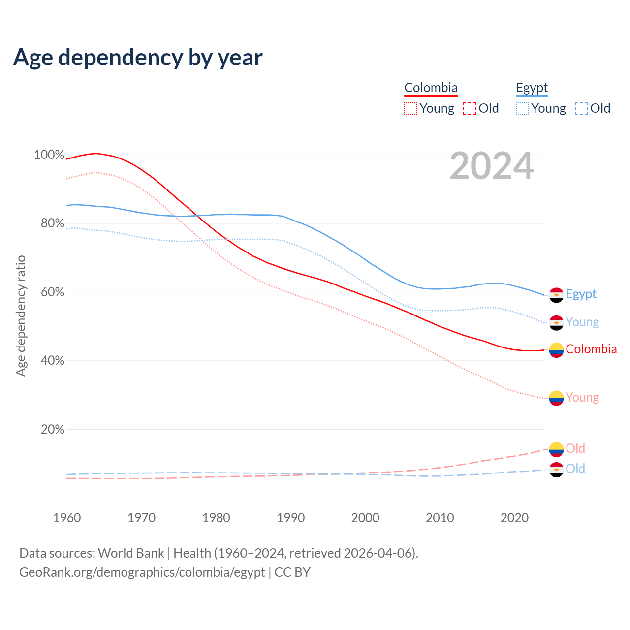 - Colombia is ranked 89/196 by median age (oldest to youngest) vs 133/196 for Egypt.