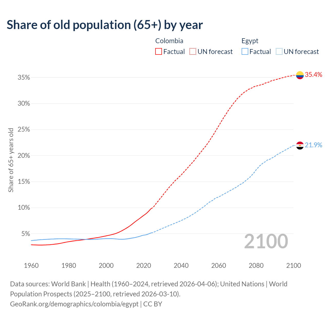 - The share of old-age demographic (65+) in Colombia is 9.78% vs 5.12% in Egypt.